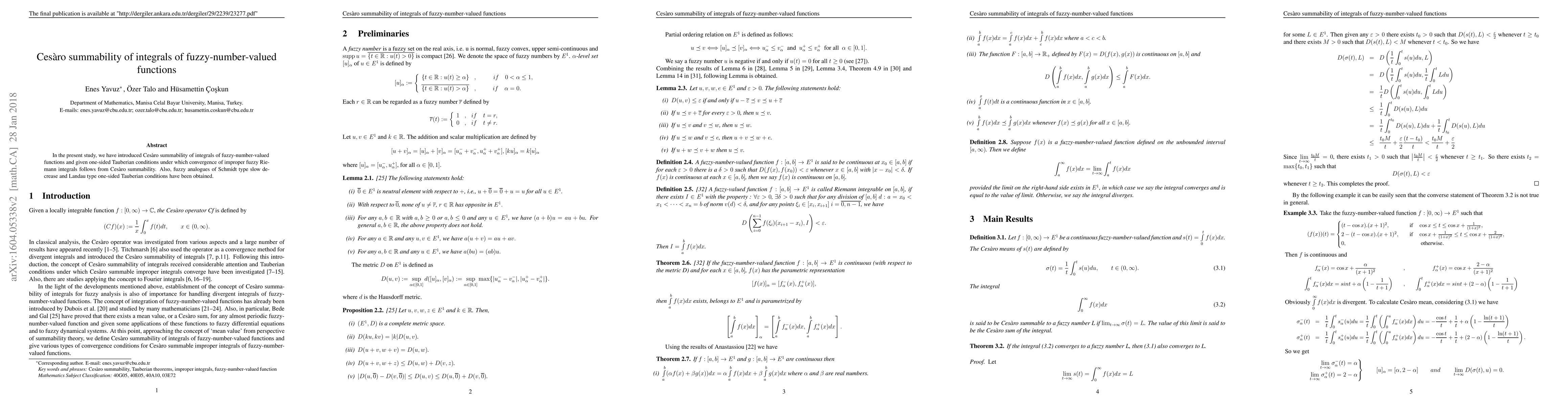 This paper introduces Cesàro summability for integrals of fuzzy-number-valued functions and establishes convergence conditions, including fuzzy analogues of Schmidt and Landau Tauberian theorems, ensuring convergence from Cesàro summability.