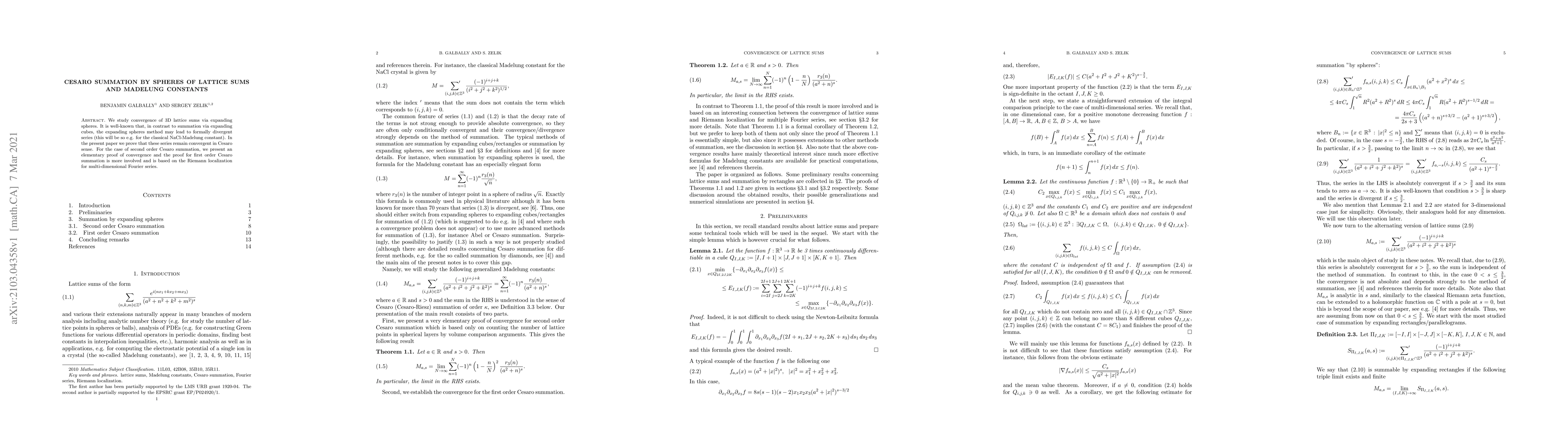 This paper investigates the convergence of 3D lattice sums using expanding spheres, demonstrating that despite potential formal divergence, these sums remain convergent in the Cesaro sense. It provides an elementary proof for second-order Cesaro summation and a more complex proof for first-order Cesaro summation using Riemann localization for multi-dimensional Fourier series.