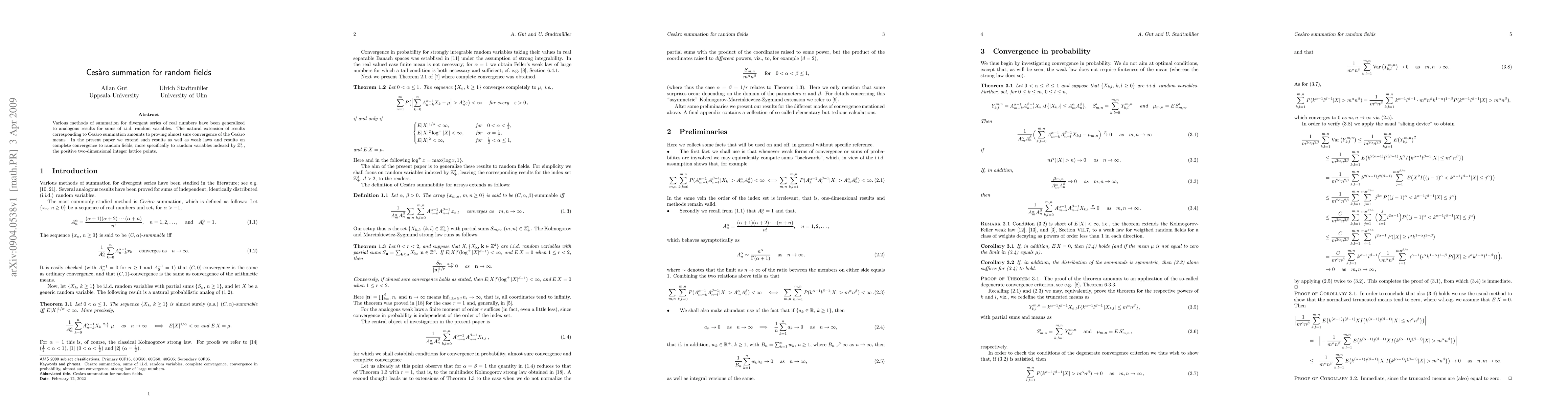 This paper extends Cesaro summation to random fields, proving almost sure convergence of Cesaro means for random variables on the positive two-dimensional integer lattice points.