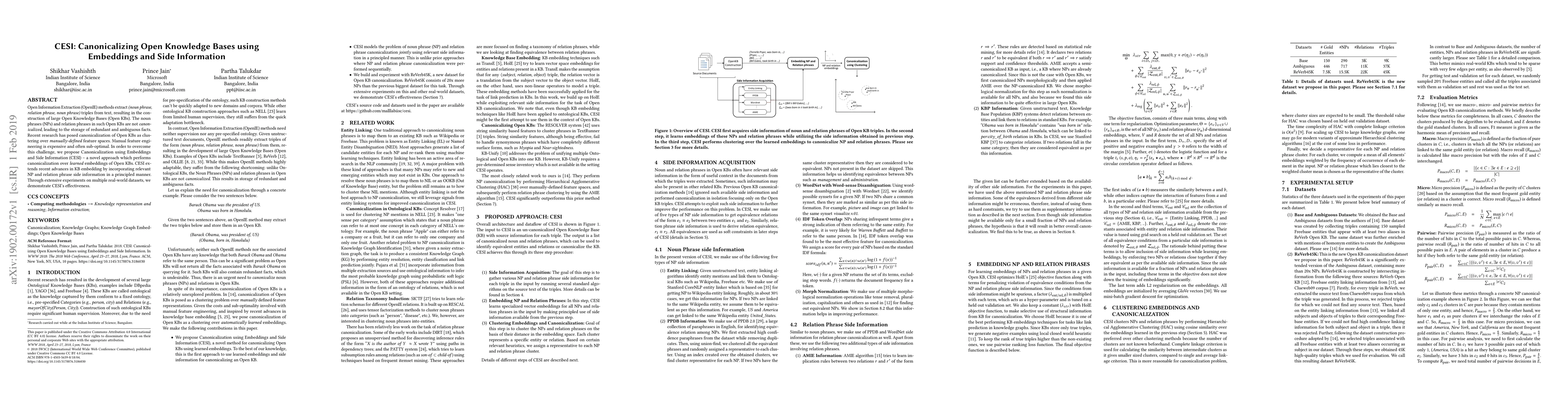 The paper proposes CESI, a method for canonicalizing Open Knowledge Bases using embeddings and side information, to address redundancy and ambiguity in Open KBs. CESI leverages learned embeddings and incorporates relevant noun and relation phrase side information to achieve effective canonicalization without manual feature engineering.