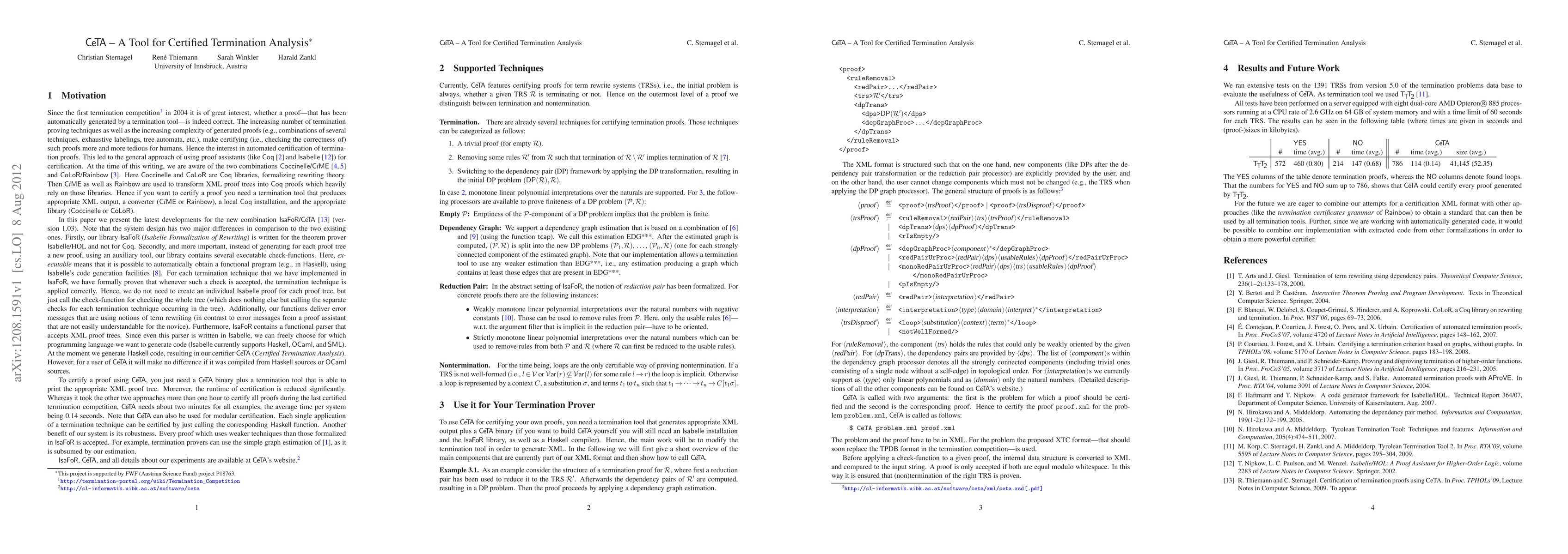 The main technical contribution is IsaFoR/CeTA, a certifier for termination proofs based on Isabelle/HOL, featuring executable check-functions for termination techniques and a functional parser for XML proof trees.