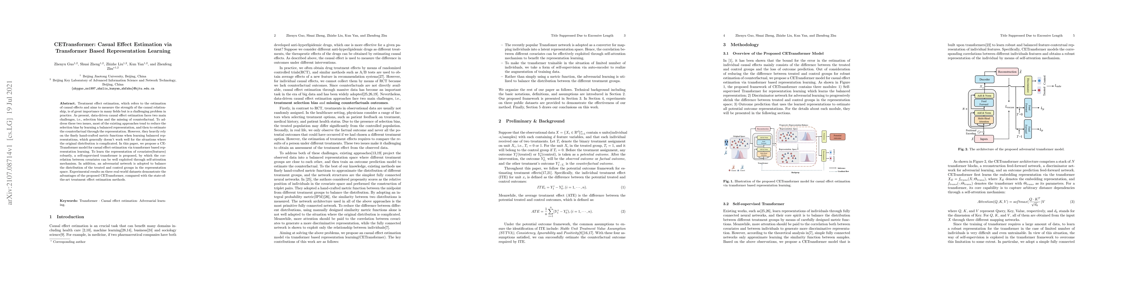 Treatment effect estimation, which refers to the estimation of causal effects and aims to measure the strength of the causal relationship, is of great importance in many fields but is a challenging problem in practice. As present, data-driven causal effect estimation faces two main challenges, i.e., selection bias and the missing of counterfactual. To address these two issues, most of the existing approaches tend to reduce the selection bias by learning a balanced representation, and then to estimate the counterfactual through the representation. However, they heavily rely on the finely hand-crafted metric functions when learning balanced representations, which generally doesn't work well for the situations where the original distribution is complicated. In this paper, we propose a CETransformer model for casual effect estimation via transformer based representation learning. To learn the representation of covariates(features) robustly, a self-supervised transformer is proposed, by which the correlation between covariates can be well exploited through self-attention mechanism. In addition, an adversarial network is adopted to balance the distribution of the treated and control groups in the representation space. Experimental results on three real-world datasets demonstrate the advantages of the proposed CETransformer, compared with the state-of-the-art treatment effect estimation methods.