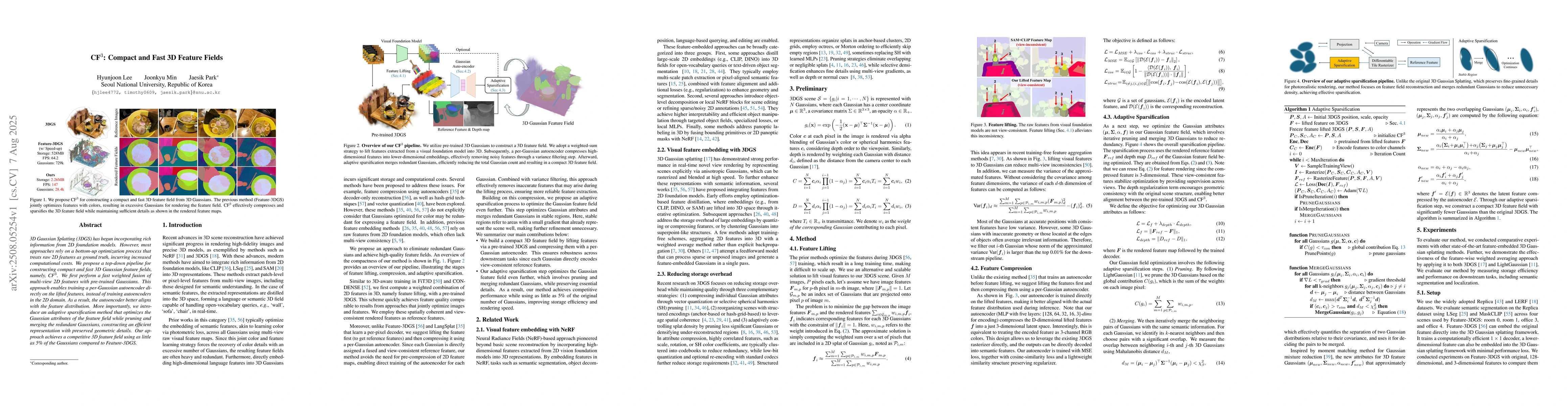 3D Gaussian Splatting (3DGS) has begun incorporating rich information from 2D foundation models. However, most approaches rely on a bottom-up optimization process that treats raw 2D features as ground truth, incurring increased computational costs. We propose a top-down pipeline for constructing compact and fast 3D Gaussian feature fields, namely, CF3. We first perform a fast weighted fusion of multi-view 2D features with pre-trained Gaussians. This approach enables training a per-Gaussian autoencoder directly on the lifted features, instead of training autoencoders in the 2D domain. As a result, the autoencoder better aligns with the feature distribution. More importantly, we introduce an adaptive sparsification method that optimizes the Gaussian attributes of the feature field while pruning and merging the redundant Gaussians, constructing an efficient representation with preserved geometric details. Our approach achieves a competitive 3D feature field using as little as 5% of the Gaussians compared to Feature-3DGS.