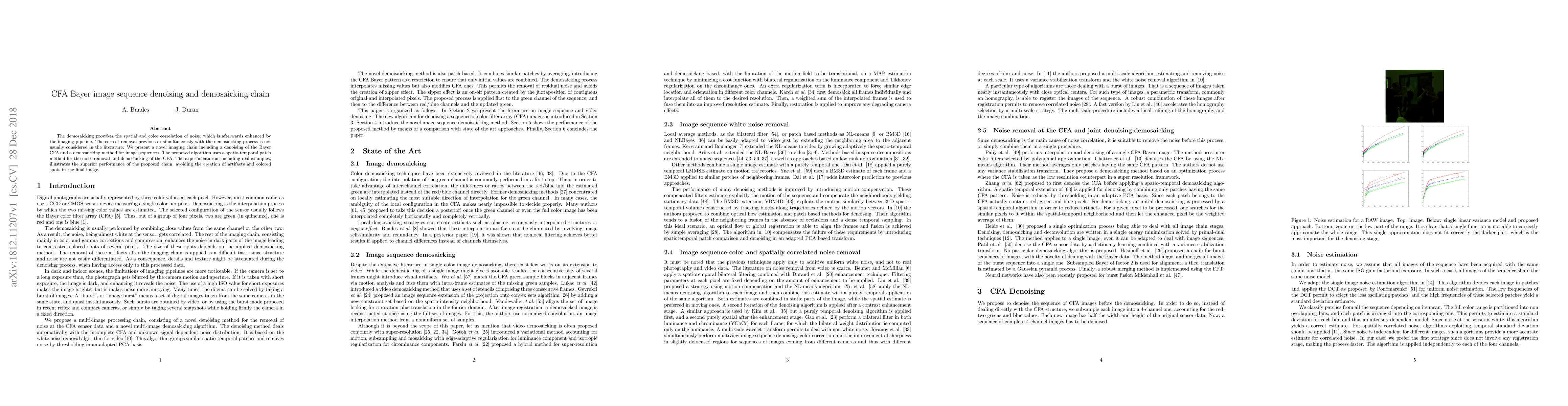 The demosaicking provokes the spatial and color correlation of noise, which is afterwards enhanced by the imaging pipeline. The correct removal previous or simultaneously with the demosaicking process is not usually considered in the literature. We present a novel imaging chain including a denoising of the Bayer CFA and a demosaicking method for image sequences. The proposed algorithm uses a spatio-temporal patch method for the noise removal and demosaicking of the CFA. The experimentation, including real examples, illustrates the superior performance of the proposed chain, avoiding the creation of artifacts and colored spots in the final image.