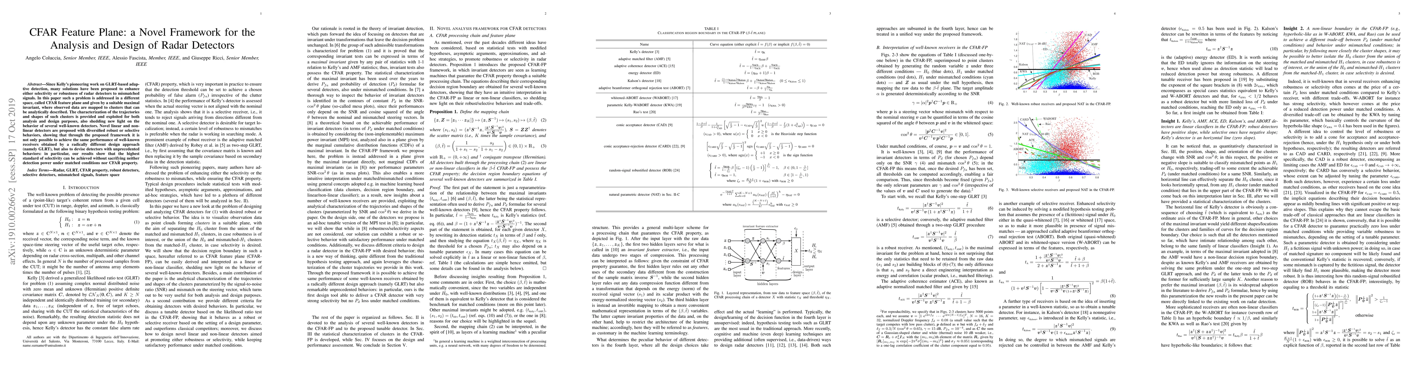 This paper introduces a novel CFAR feature plane framework for radar detector analysis and design, mapping observed data into clusters for enhanced selectivity and robustness. The proposed framework enables the development of new linear and non-linear detectors with improved performance and unprecedented behaviors, achieving high selectivity without compromising detection power or constant false alarm rate (CFAR) properties.