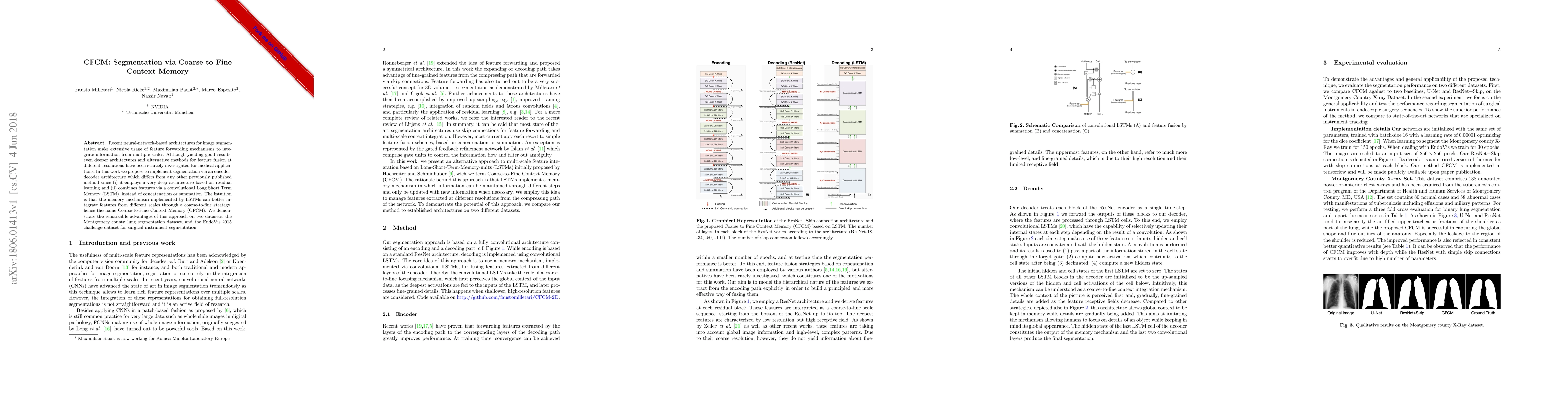 Recent neural-network-based architectures for image segmentation make extensive usage of feature forwarding mechanisms to integrate information from multiple scales. Although yielding good results, even deeper architectures and alternative methods for feature fusion at different resolutions have been scarcely investigated for medical applications. In this work we propose to implement segmentation via an encoder-decoder architecture which differs from any other previously published method since (i) it employs a very deep architecture based on residual learning and (ii) combines features via a convolutional Long Short Term Memory (LSTM), instead of concatenation or summation. The intuition is that the memory mechanism implemented by LSTMs can better integrate features from different scales through a coarse-to-fine strategy; hence the name Coarse-to-Fine Context Memory (CFCM). We demonstrate the remarkable advantages of this approach on two datasets: the Montgomery county lung segmentation dataset, and the EndoVis 2015 challenge dataset for surgical instrument segmentation.