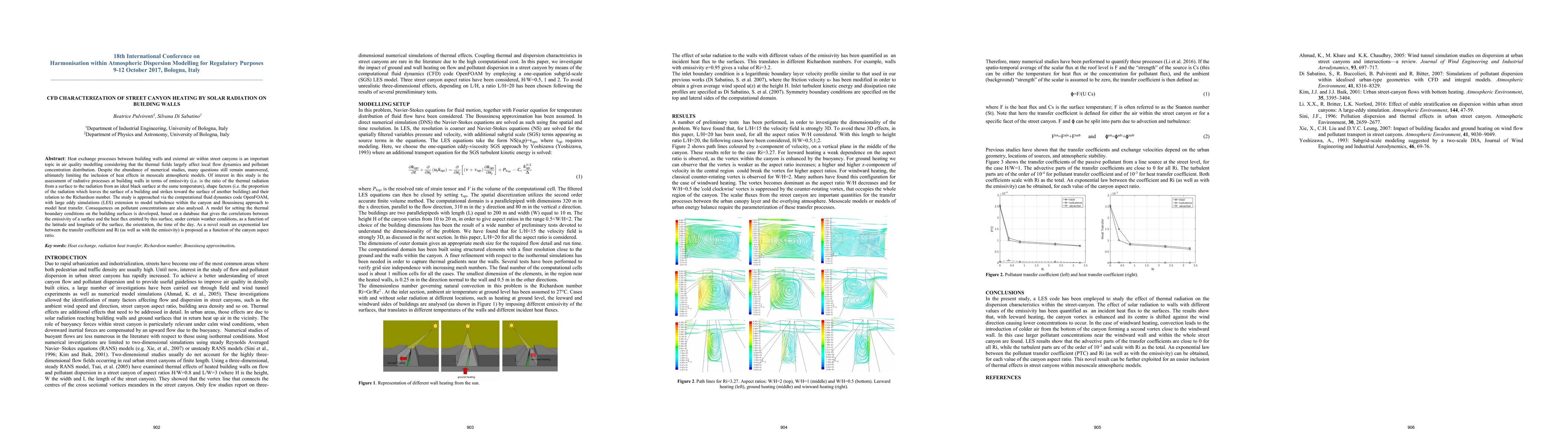 Heat exchange processes between building walls and external air within street canyons is an important topic in air quality modelling considering that the thermal fields largely affect local flow dynamics and pollutant concentration distribution. Despite the abundance of numerical studies, many questions still remain unanswered, ultimately limiting the inclusion of heat effects in mesocale atmospheric models. Of interest in this study is the assessment of radiative processes at building walls in terms of emissivity (i.e. is the ratio of the thermal radiation from a surface to the radiation from an ideal black surface at the same temperature), shape factors (i.e. the proportion of the radiation which leaves the surface of a building and strikes toward the surface of another building) and their relation to the Richardson number. The study is approached via the computational fluid dynamics code OpenFOAM, with large eddy simulations (LES) extension to model turbulence within the canyon and Boussinesq approach to model heat transfer. Consequences on pollutant concentrations are also analysed. A model for setting the thermal boundary conditions on the building surfaces is developed, based on a database that gives the correlations between the emissivity of a surface and the heat flux emitted by this surface, under certain weather conditions, as a function of the latitude and longitude of the surface, the orientation, the time of the day. As a novel result an exponential law between the transfer coefficient and Ri (as well as with the emissivity) is proposed as a function of the canyon aspect ratio.