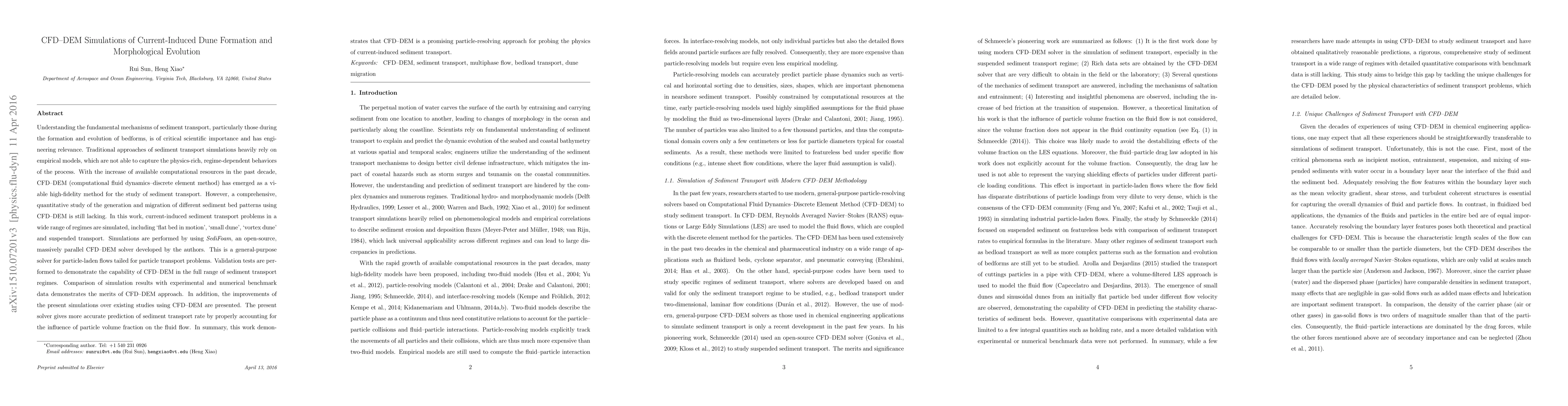 This paper employs CFD-DEM simulations to study the formation and evolution of sediment bedforms under current-induced transport, demonstrating the method's accuracy through validation and comparison with experimental data. The simulations reveal detailed physics-rich behaviors of sediment transport across various regimes, highlighting the advantages of CFD-DEM over traditional empirical models.