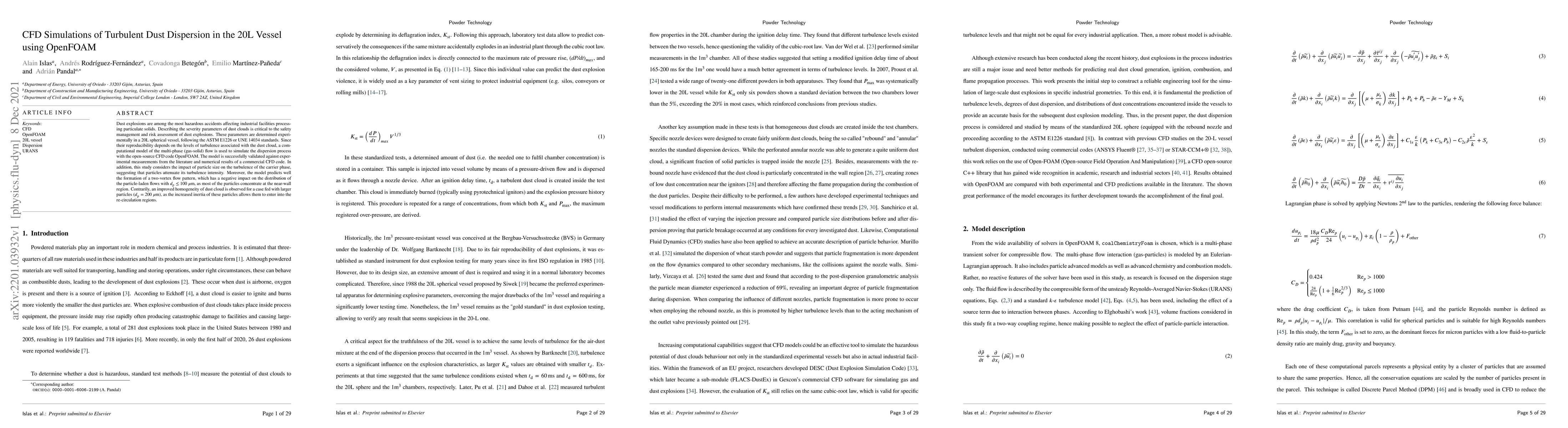 Researchers used CFD simulations to study dust dispersion in a 20L vessel, finding that larger particles reduce turbulence and improve cloud homogeneity, while smaller particles concentrate near the walls.