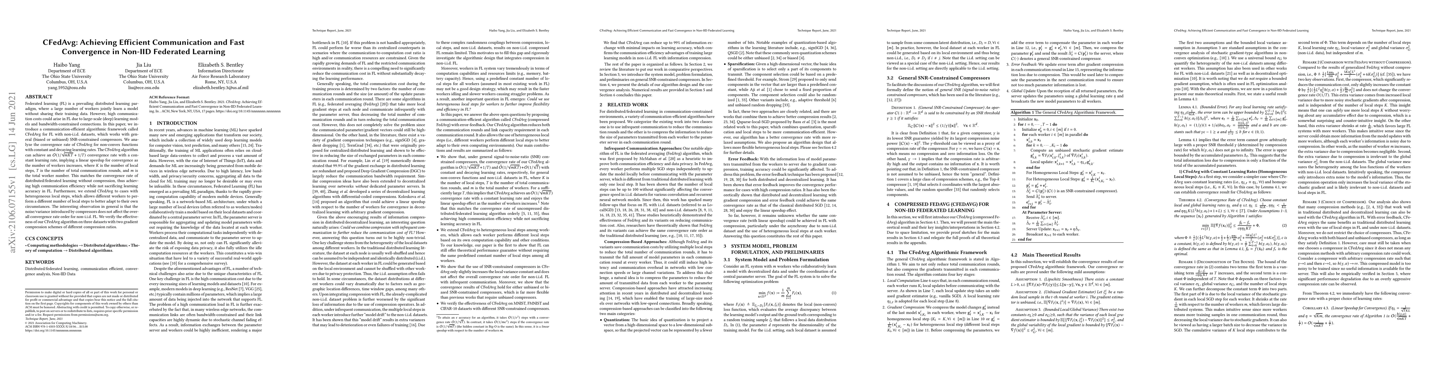 CFedAvg is a communication-efficient framework for non-IID federated learning, achieving fast convergence with a linear speedup as the number of workers increases. It maintains high communication efficiency without compromising learning accuracy, even with heterogeneous local steps and varying compression ratios.