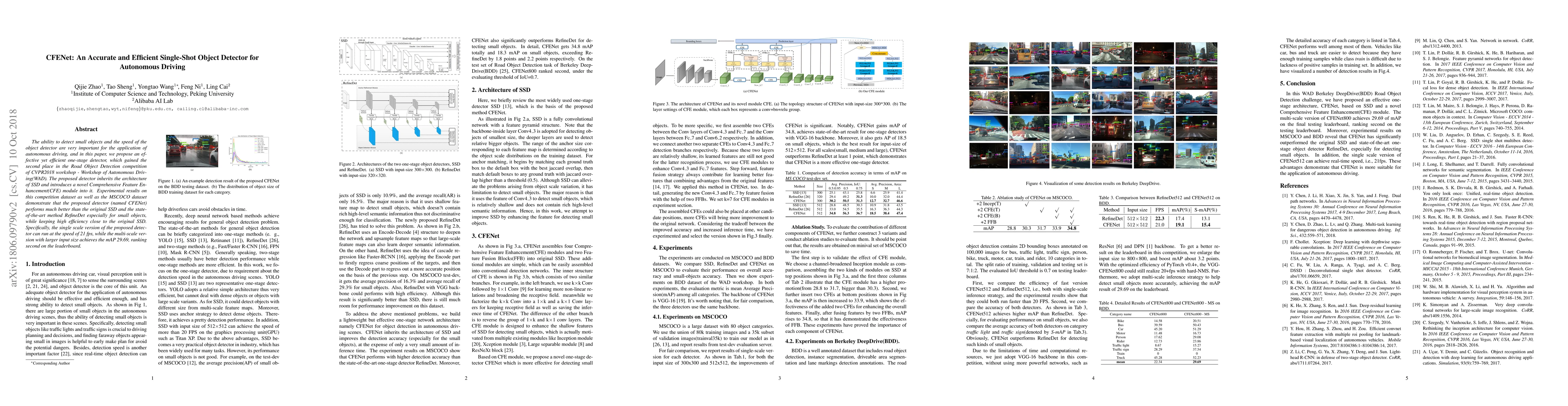 CFENet is an efficient single-shot object detector that enhances feature extraction for better detection of small objects, achieving high performance in the CVPR2018 Road Object Detection competition. It outperforms the original SSD and RefineDet while maintaining speed, running at 21 fps with a single scale.