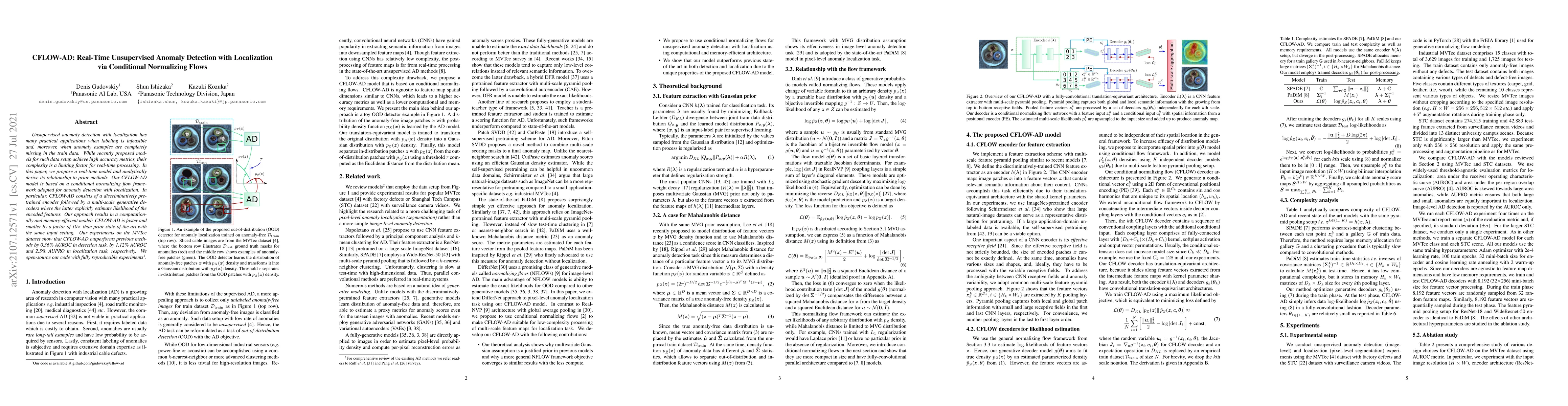 This paper introduces CFLOW-AD, a real-time unsupervised anomaly detection model with localization using conditional normalizing flows. The proposed model is computationally efficient, outperforming previous methods by significant margins in both detection and localization tasks on the MVTec dataset.