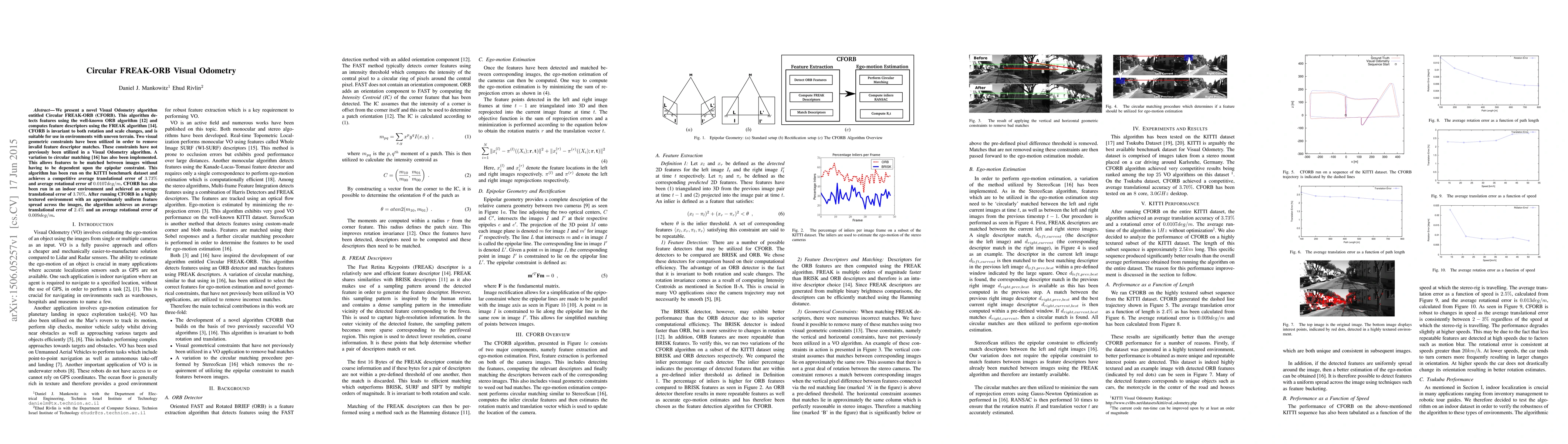 CFORB is a novel Visual Odometry algorithm that combines ORB for feature detection and FREAK for feature descriptors, achieving competitive accuracy on the KITTI dataset and in various environments. It utilizes unique geometric constraints and circular matching to enhance robustness in uneven terrains.