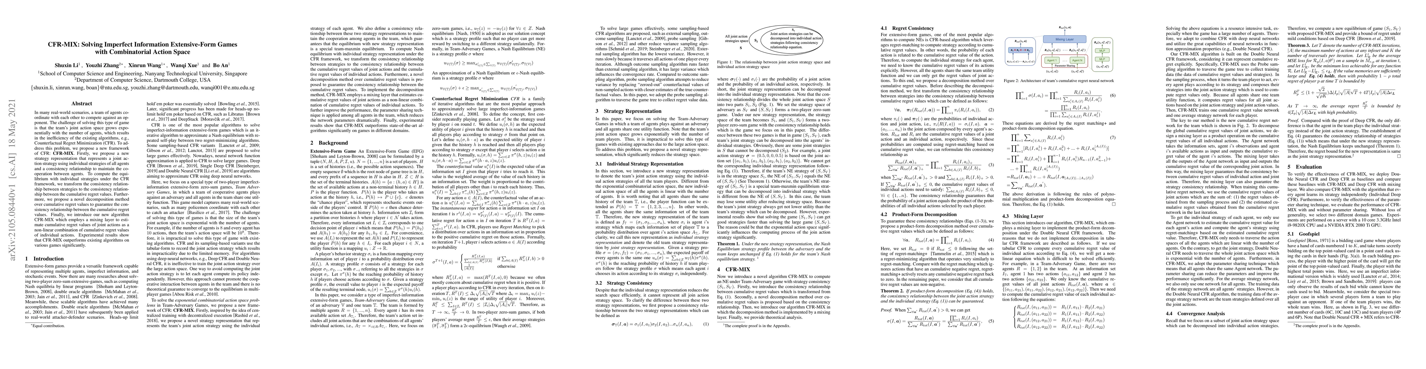 CFR-MIX introduces a novel framework to solve extensive-form games with combinatorial action spaces by representing joint strategies and employing a mixing layer to estimate cumulative regret values, significantly outperforming existing algorithms in experiments.