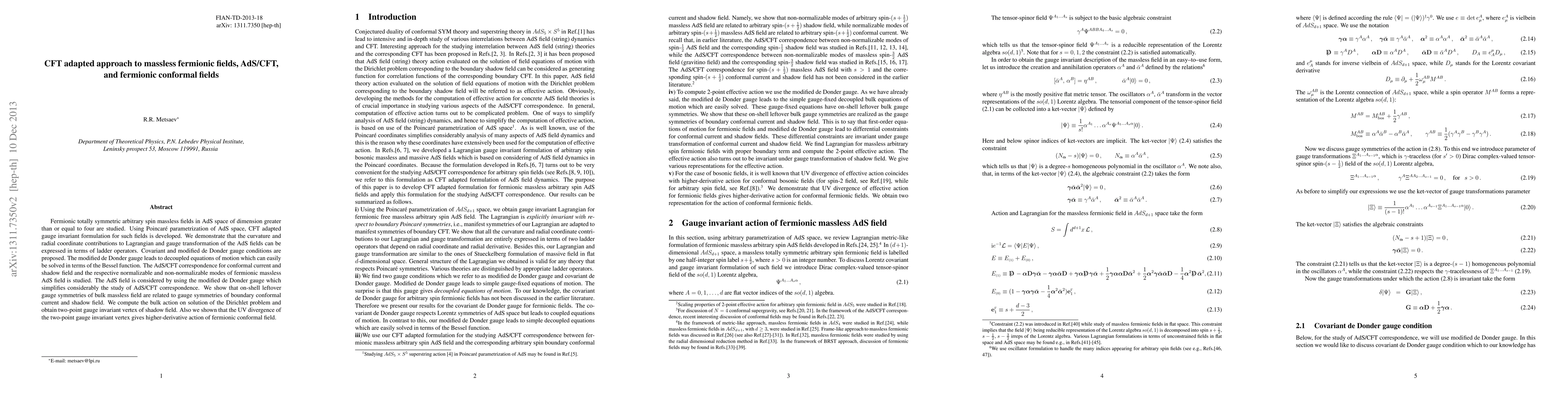 Fermionic totally symmetric arbitrary spin massless fields in AdS space of dimension greater than or equal to four are studied. Using Poincar\'e parametrization of AdS space, CFT adapted gauge invariant formulation for such fields is developed. We demonstrate that the curvature and radial coordinate contributions to Lagrangian and gauge transformation of the AdS fields can be expressed in terms of ladder operators. Covariant and modified de Donder gauge conditions are proposed. The modified de Donder gauge leads to decoupled equations of motion which can easily be solved in terms of the Bessel function. The AdS/CFT correspondence for conformal current and shadow field and the respective normalizable and non-normalizable modes of fermionic massless AdS field is studied. The AdS field is considered by using the modified de Donder gauge which simplifies considerably the study of AdS/CFT correspondence. We show that on-shell leftover gauge symmetries of bulk massless field are related to gauge symmetries of boundary conformal current and shadow field. We compute the bulk action on solution of the Dirichlet problem and obtain two-point gauge invariant vertex of shadow field. Also we shown that the UV divergence of the two-point gauge invariant vertex gives higher-derivative action of fermionic conformal field.