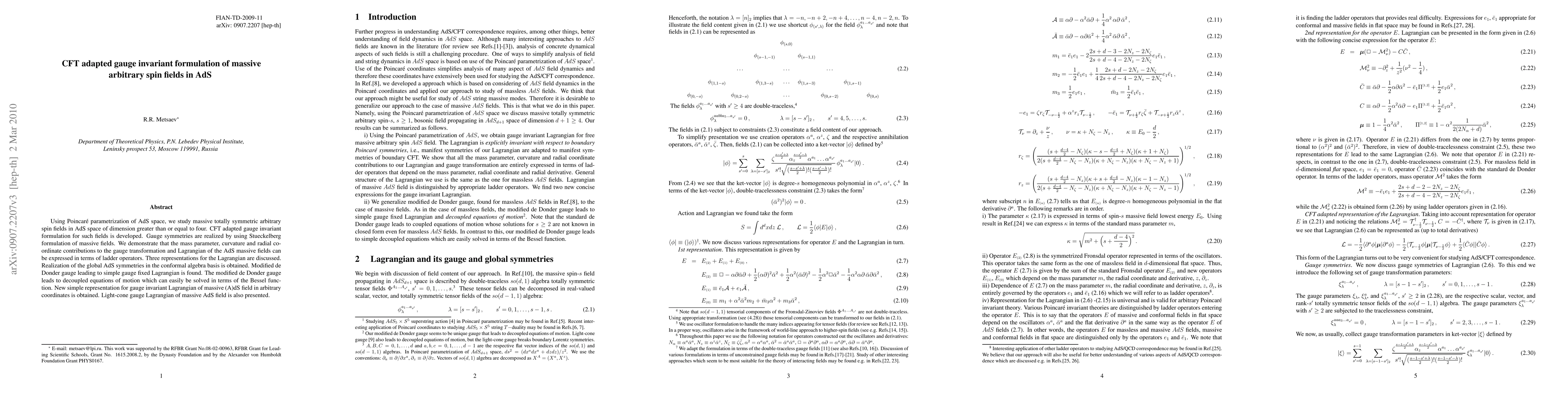 This paper develops a CFT adapted gauge invariant formulation for massive arbitrary spin fields in AdS space using Poincare parametrization. It employs Stueckelberg formulation and ladder operators to express mass, curvature, and radial contributions, leading to a simplified gauge fixed Lagrangian and decoupled equations of motion solvable via Bessel functions.
