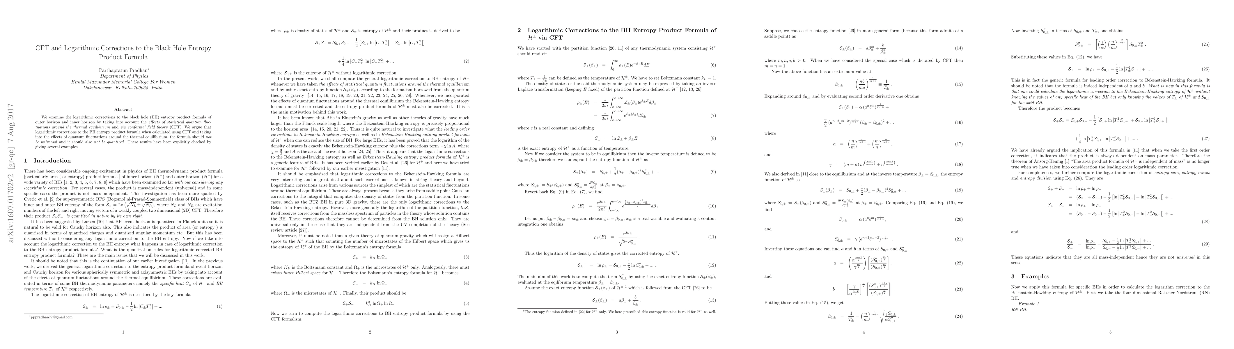 This paper investigates logarithmic corrections to the black hole entropy product formula using conformal field theory (CFT) and statistical quantum fluctuations around thermal equilibrium, concluding that these corrections are neither universal nor quantized. The findings are supported by several explicit examples.