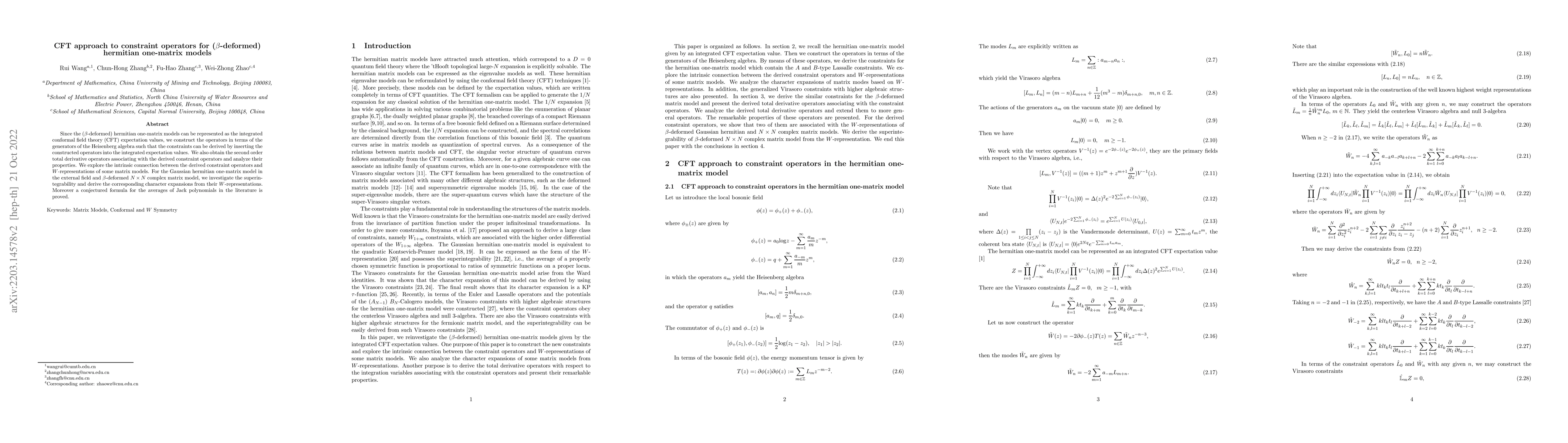 This paper constructs constraint operators for ($\beta$-deformed) hermitian one-matrix models using integrated conformal field theory (CFT) expectations, deriving second-order total derivative operators and exploring connections to $W$-representations. It also proves a conjectured formula for averages of Jack polynomials and investigates superintegrability in specific matrix models.