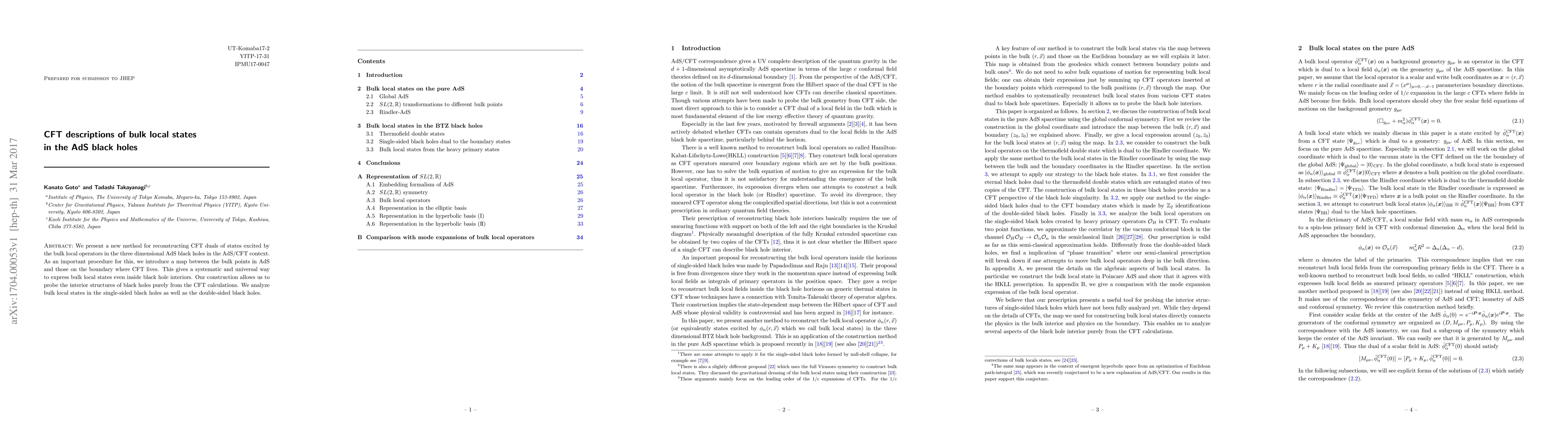 The paper presents a new method for reconstructing CFT duals of bulk local states in three-dimensional AdS black holes, utilizing a map between bulk points in AdS and boundary points where the CFT resides, enabling the probing of black hole interior structures purely from CFT calculations.