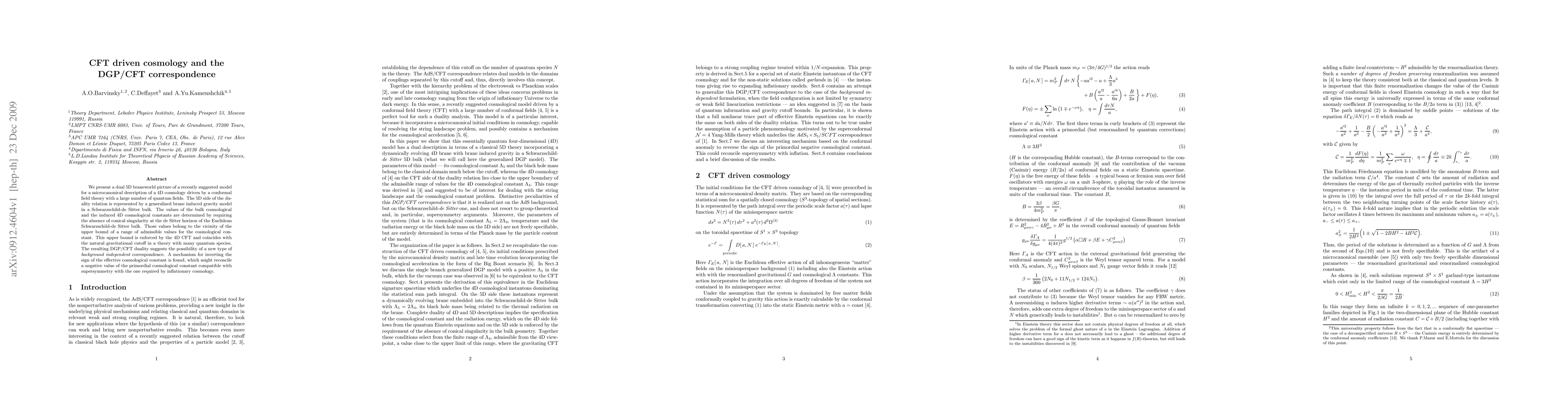 We present a dual 5D braneworld picture of a recently suggested model for a microcanonical description of a 4D cosmology driven by a conformal field theory with a large number of quantum fields. The 5D side of the duality relation is represented by a generalized brane induced gravity model in a Schwarzschild-de Sitter bulk. The values of the bulk cosmological and the induced 4D cosmological constants are determined by requiring the absence of conical singularity at the de Sitter horizon of the Euclidean Schwarzschild-de Sitter bulk. Those values belong to the vicinity of the upper bound of a range of admissible values for the cosmological constant. This upper bound is enforced by the 4D CFT and coincides with the natural gravitational cutoff in a theory with many quantum species. The resulting DGP/CFT duality suggests the possibility of a new type of {\em background independent} correspondence. A mechanism for inverting the sign of the effective cosmological constant is found, which might reconcile a negative value of the primordial cosmological constant compatible with supersymmetry with the one required by inflationary cosmology.