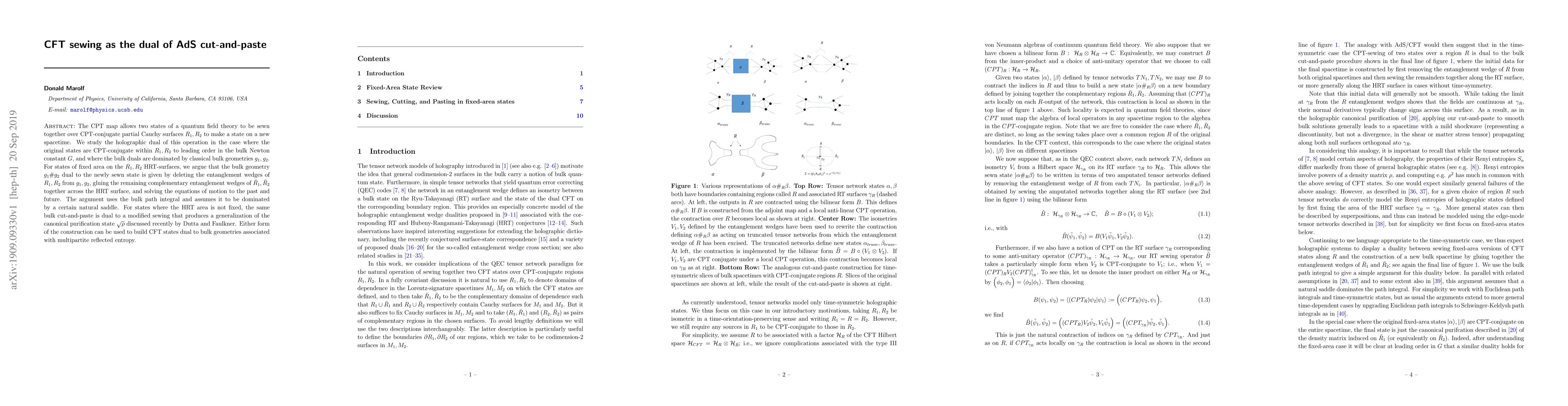 The CPT map allows two states of a quantum field theory to be sewn together over CPT-conjugate partial Cauchy surfaces $R_1,R_2$ to make a state on a new spacetime. We study the holographic dual of this operation in the case where the original states are CPT-conjugate within $R_1,R_2$ to leading order in the bulk Newton constant $G$, and where the bulk duals are dominated by classical bulk geometries $g_1,g_2$. For states of fixed area on the $R_1,R_2$ HRT-surfaces, we argue that the bulk geometry $g_1 \# g_2$ dual to the newly sewn state is given by deleting the entanglement wedges of $R_1,R_2$ from $g_1,g_2$, gluing the remaining complementary entanglement wedges of ${\bar R}_1, {\bar R}_2$ together across the HRT surface, and solving the equations of motion to the past and future. The argument uses the bulk path integral and assumes it to be dominated by a certain natural saddle. For states where the HRT area is not fixed, the same bulk cut-and-paste is dual to a modified sewing that produces a generalization of the canonical purification state $\sqrt{\rho}$ discussed recently by Dutta and Faulkner. Either form of the construction can be used to build CFT states dual to bulk geometries associated with multipartite reflected entropy.