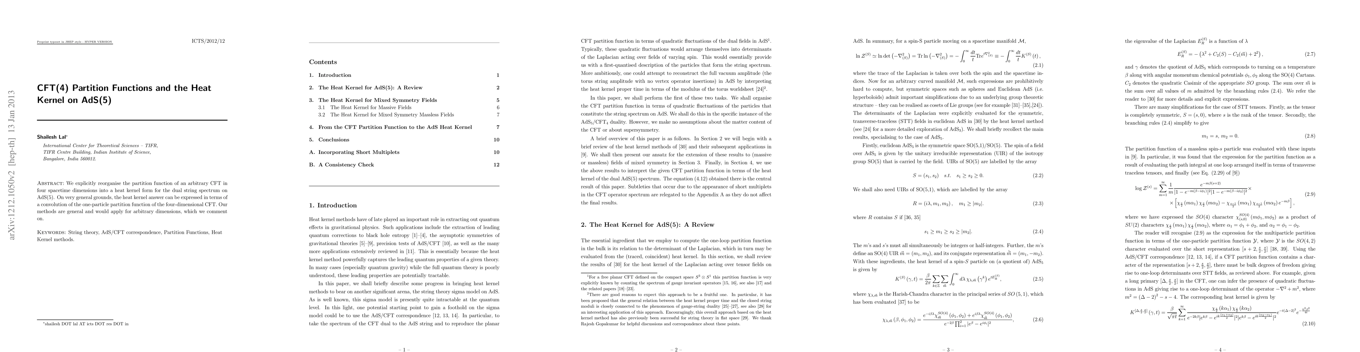 We explicitly reorganise the partition function of an arbitrary CFT in four spacetime dimensions into a heat kernel form for the dual string spectrum on AdS(5). On very general grounds, the heat kernel answer can be expressed in terms of a convolution of the one-particle partition function of the four-dimensional CFT. Our methods are general and would apply for arbitrary dimensions, which we comment on.