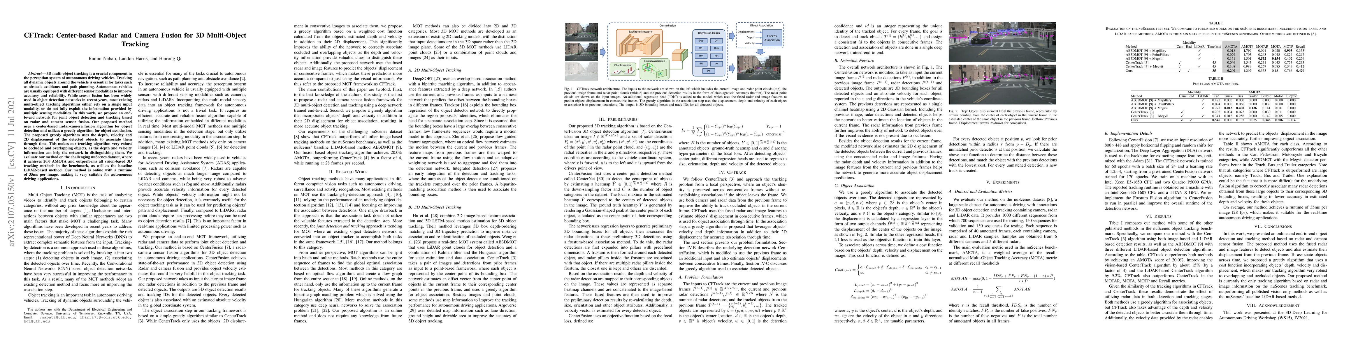 CFTrack proposes an end-to-end network for 3D multi-object tracking by fusing radar and camera data, achieving superior performance on the nuScenes dataset with robust handling of occlusions and overlaps. The method is efficient, running at 35ms per image, making it suitable for real-time autonomous driving applications.