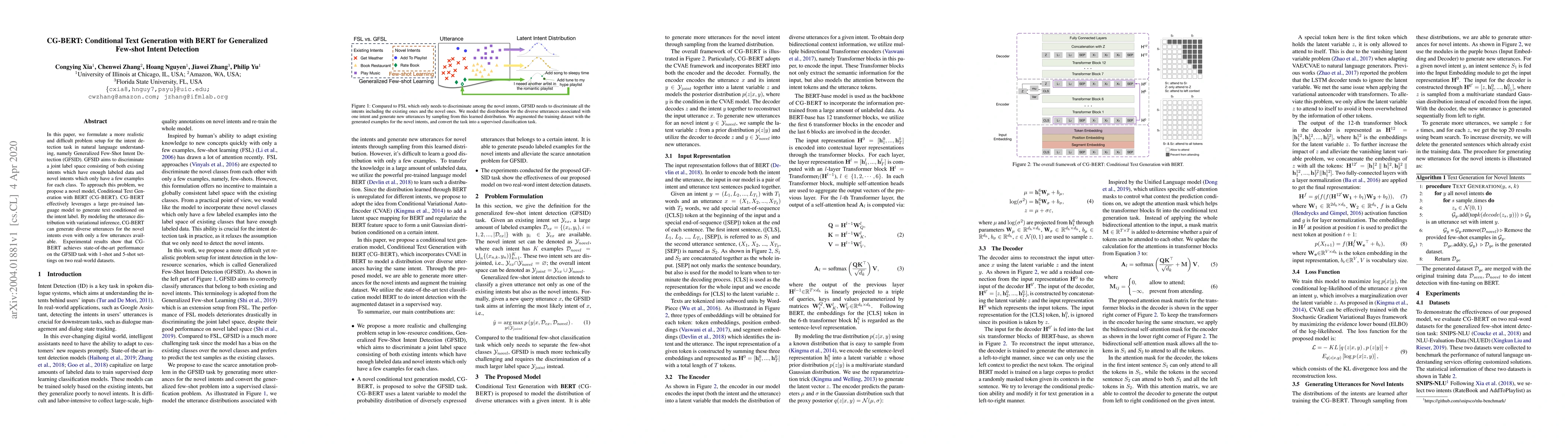 CG-BERT is proposed for Generalized Few-Shot Intent Detection (GFSID), leveraging BERT for text generation conditioned on intent labels. It uses variational inference to generate diverse utterances for novel intents with limited examples, achieving state-of-the-art performance in few-shot settings.
