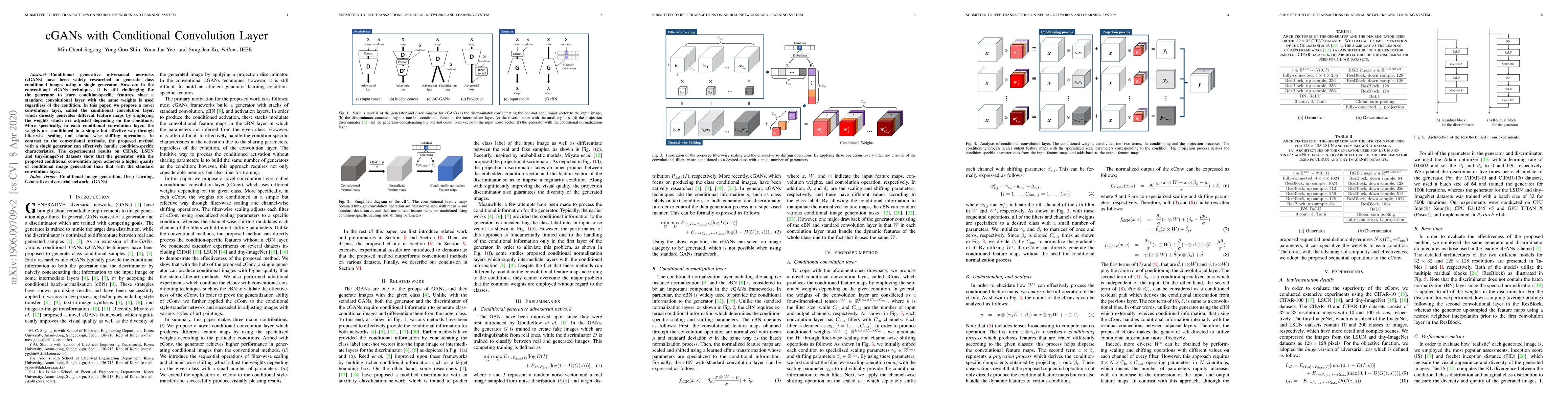 A new convolution layer called the conditional convolution layer is proposed to improve generative adversarial networks (cGANs) in generating class-conditional images with better quality. This innovation enables condition-specific characteristics to be learned by adjusting weights through filter-wise scaling and channel-wise shifting operations.