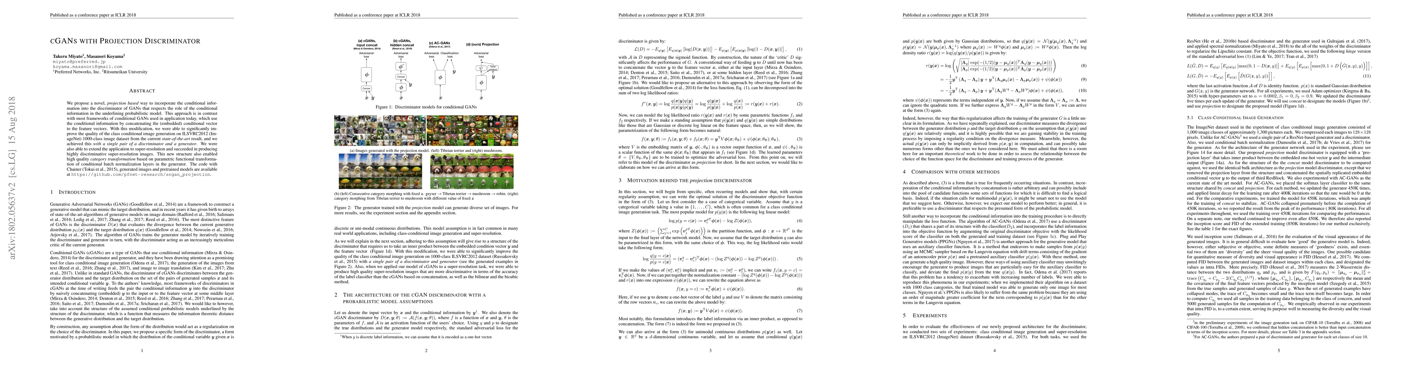 We propose a novel, projection based way to incorporate the conditional information into the discriminator of GANs that respects the role of the conditional information in the underlining probabilistic model. This approach is in contrast with most frameworks of conditional GANs used in application today, which use the conditional information by concatenating the (embedded) conditional vector to the feature vectors. With this modification, we were able to significantly improve the quality of the class conditional image generation on ILSVRC2012 (ImageNet) 1000-class image dataset from the current state-of-the-art result, and we achieved this with a single pair of a discriminator and a generator. We were also able to extend the application to super-resolution and succeeded in producing highly discriminative super-resolution images. This new structure also enabled high quality category transformation based on parametric functional transformation of conditional batch normalization layers in the generator.