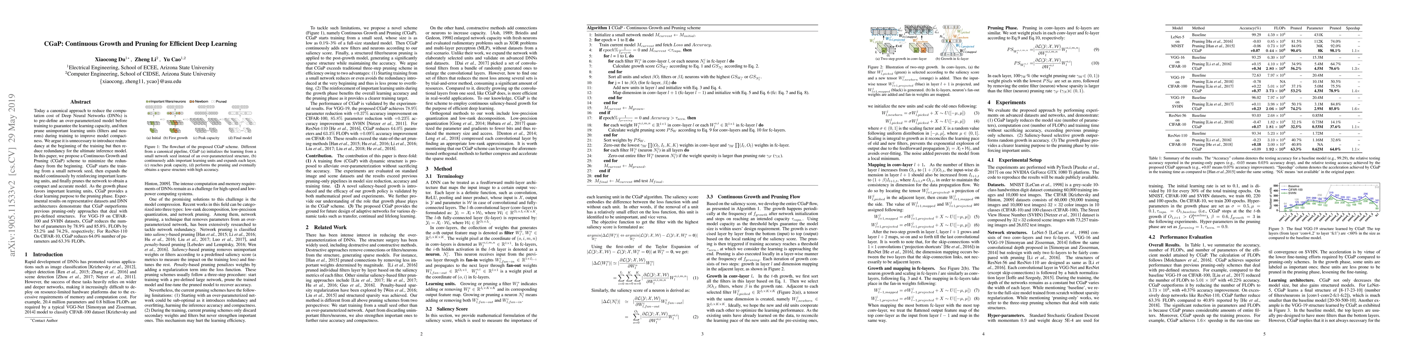 The CGaP scheme proposes a method for efficient deep learning by continuously growing and pruning a neural network during training, avoiding initial redundancy and achieving significant reductions in parameters and computational costs. Experimental results show CGaP outperforms traditional pruning methods, achieving up to 85.8% reduction in parameters and 74.2% in FLOPs for VGG-19 on CIFAR-100 and SVHN datasets.