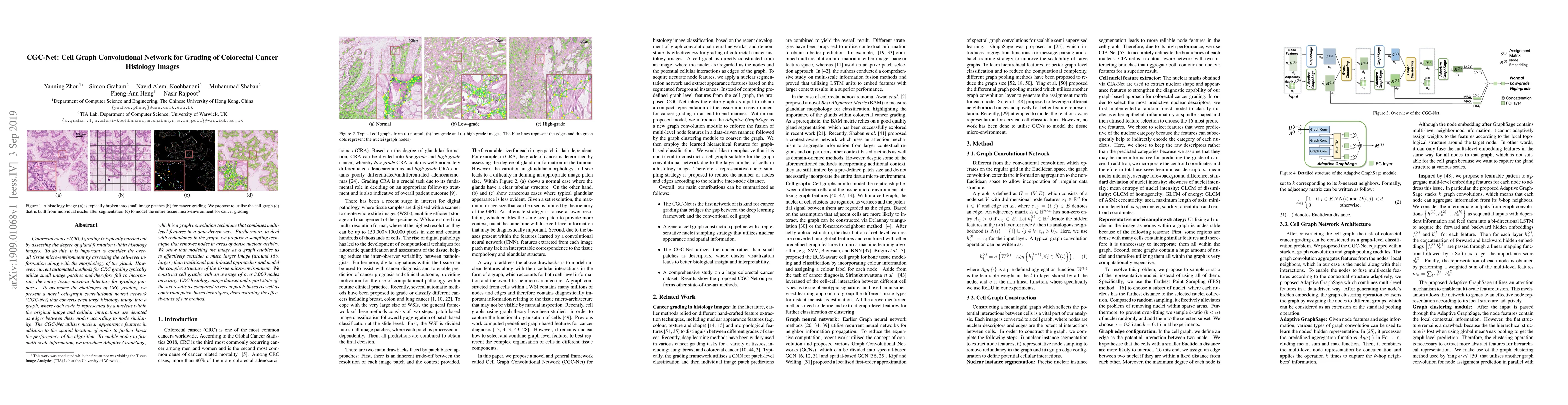 CGC-Net, a novel cell-graph convolutional network, converts colorectal cancer histology images into graphs to model the tissue micro-environment, achieving state-of-the-art grading results by incorporating multi-scale information and reducing redundancy.