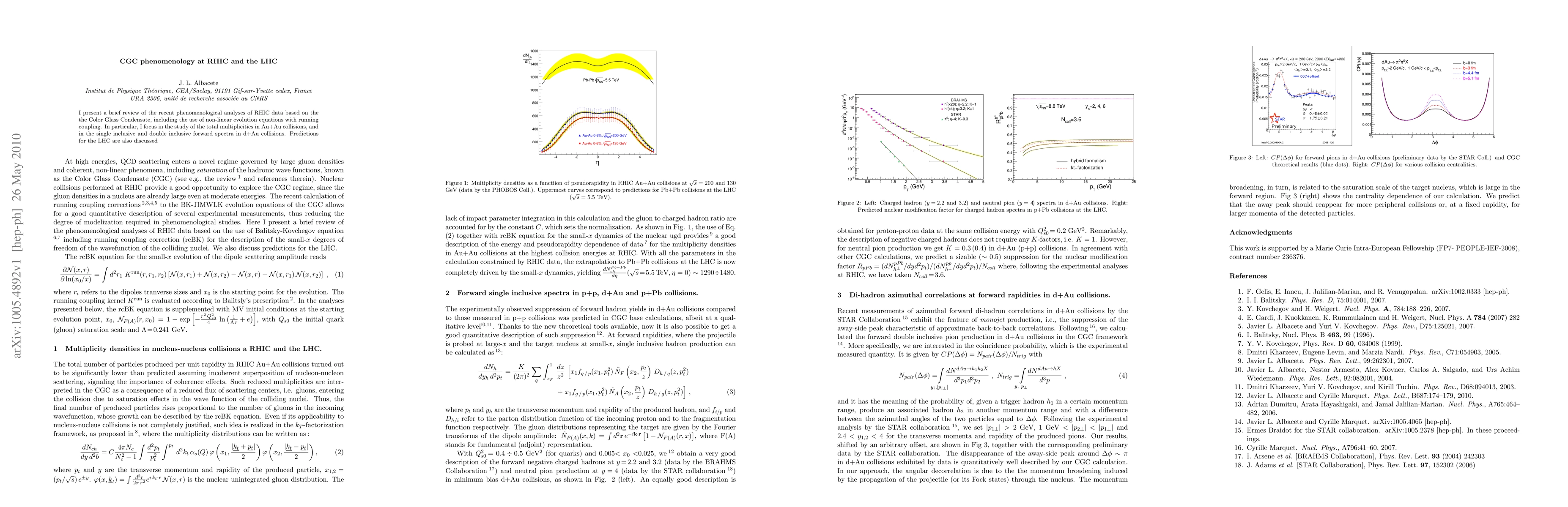 I present a brief review of the recent phenomenological analyses of RHIC data based on the the Color Glass Condensate, including the use of non-linear evolution equations with running coupling. In particular, I focus in the study of the total multiplicities in Au+Au collisions, and in the single inclusive and double inclusive forward spectra in d+Au collisions. Predictions for the LHC are also discussed.