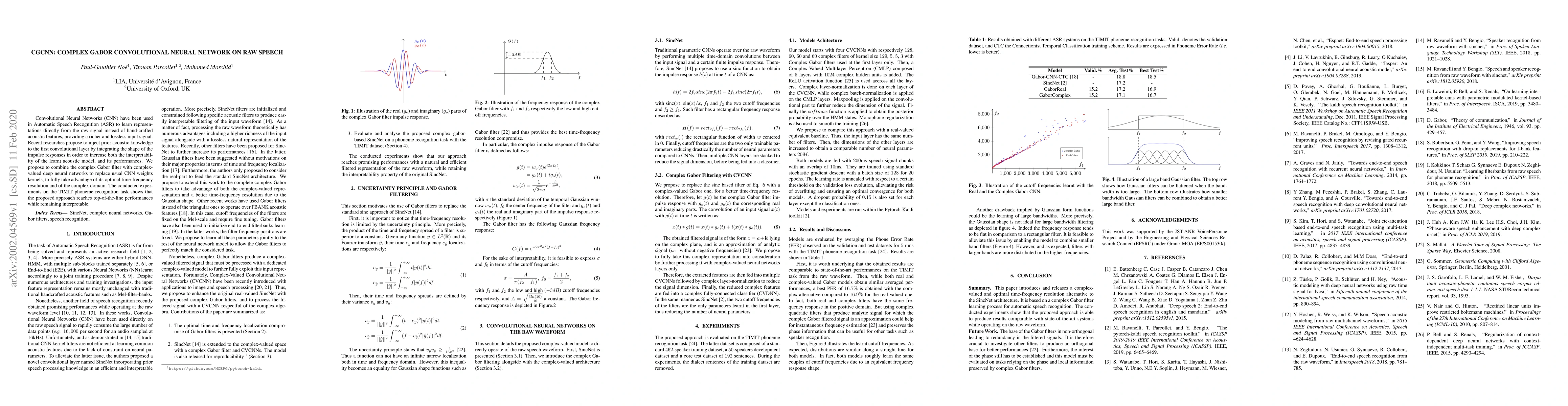 The CGCNN model integrates complex Gabor filters into convolutional layers to enhance time-frequency resolution and performance in Automatic Speech Recognition. Experiments on the TIMIT dataset demonstrate superior results compared to traditional CNNs.