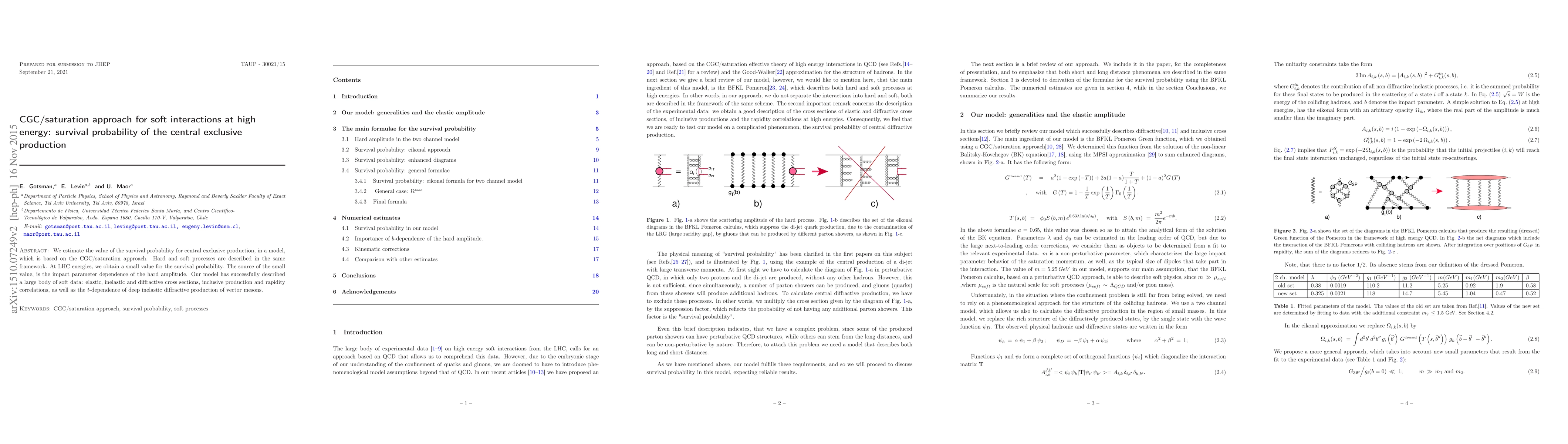 This paper estimates the survival probability for central exclusive production using the CGC/saturation approach, finding a small value at LHC energies due to the impact parameter dependence of the hard amplitude. The model successfully describes various soft interaction data, including elastic, inelastic, and diffractive cross sections.
