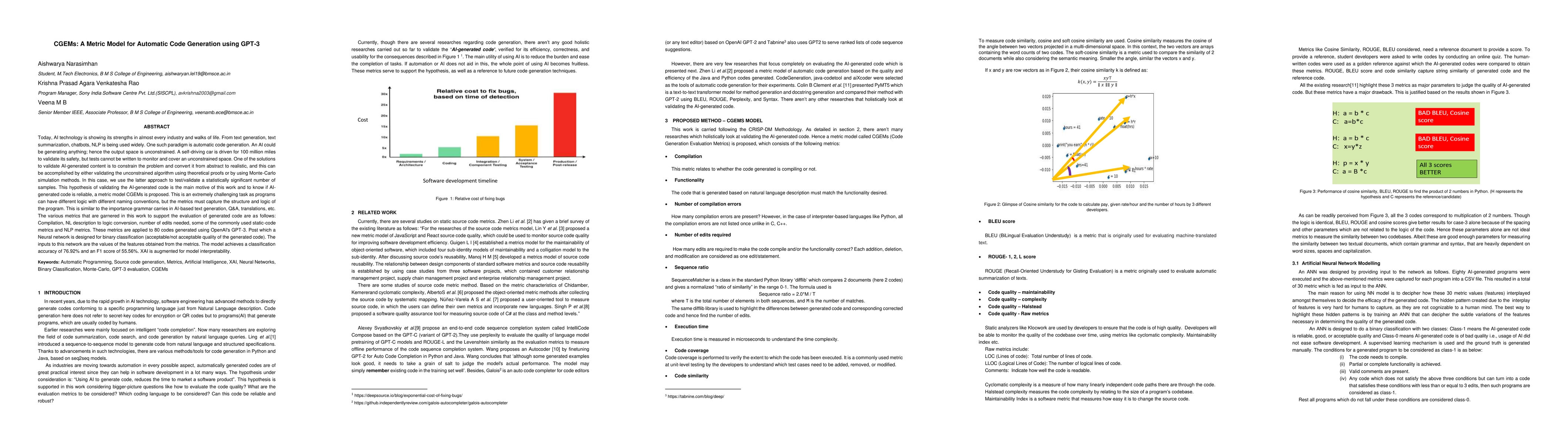 Today, AI technology is showing its strengths in almost every industry and walks of life. From text generation, text summarization, chatbots, NLP is being used widely. One such paradigm is automatic code generation. An AI could be generating anything; hence the output space is unconstrained. A self-driving car is driven for 100 million miles to validate its safety, but tests cannot be written to monitor and cover an unconstrained space. One of the solutions to validate AI-generated content is to constrain the problem and convert it from abstract to realistic, and this can be accomplished by either validating the unconstrained algorithm using theoretical proofs or by using Monte-Carlo simulation methods. In this case, we use the latter approach to test/validate a statistically significant number of samples. This hypothesis of validating the AI-generated code is the main motive of this work and to know if AI-generated code is reliable, a metric model CGEMs is proposed. This is an extremely challenging task as programs can have different logic with different naming conventions, but the metrics must capture the structure and logic of the program. This is similar to the importance grammar carries in AI-based text generation, Q&A, translations, etc. The various metrics that are garnered in this work to support the evaluation of generated code are as follows: Compilation, NL description to logic conversion, number of edits needed, some of the commonly used static-code metrics and NLP metrics. These metrics are applied to 80 codes generated using OpenAI's GPT-3. Post which a Neural network is designed for binary classification (acceptable/not acceptable quality of the generated code). The inputs to this network are the values of the features obtained from the metrics. The model achieves a classification accuracy of 76.92% and an F1 score of 55.56%. XAI is augmented for model interpretability.