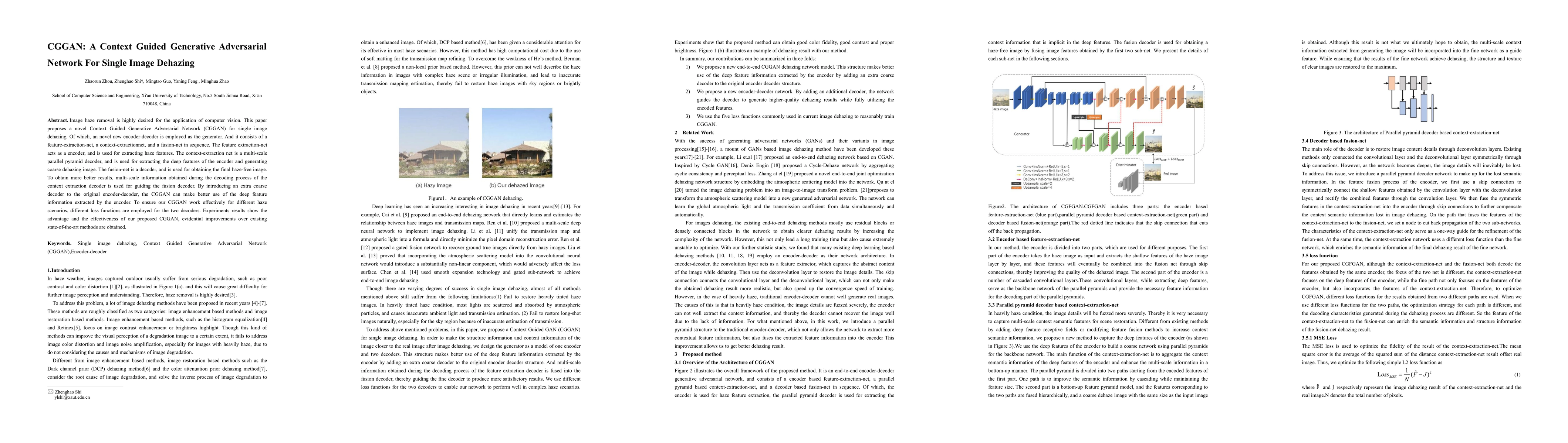 This paper proposes a Context Guided Generative Adversarial Network (CGGAN) for single image dehazing, utilizing a novel encoder-decoder structure with feature extraction, context extraction, and fusion networks to achieve superior haze removal results compared to existing methods.
