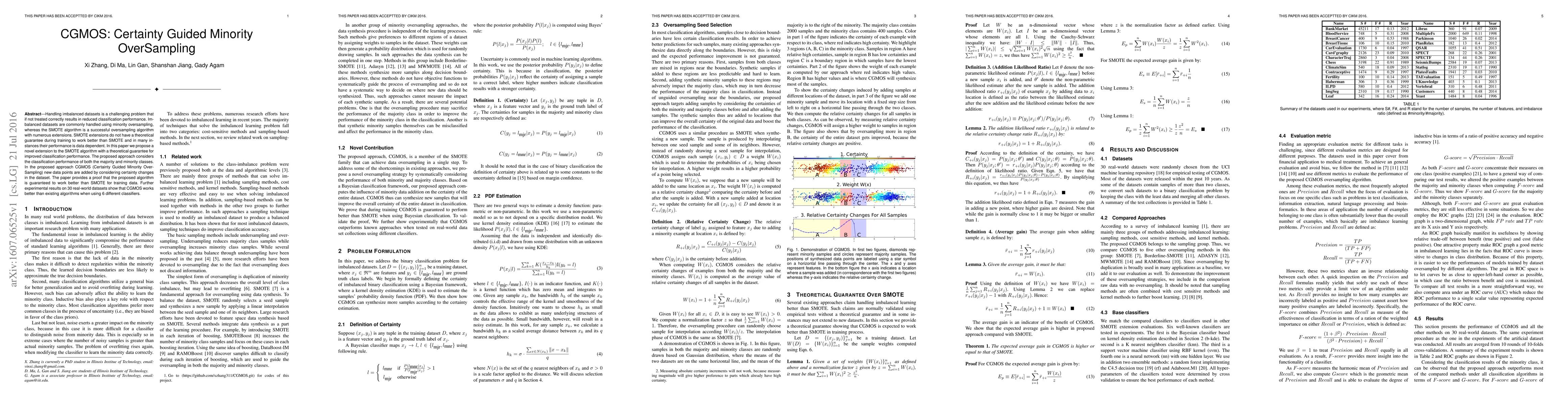 CGMOS (Certainty Guided Minority OverSampling) proposes a novel extension to the SMOTE algorithm with a theoretical guarantee for improved classification performance on imbalanced datasets by considering certainty changes in the dataset. Experimental results show CGMOS outperforms existing algorithms across 30 real-world datasets and six classifiers.