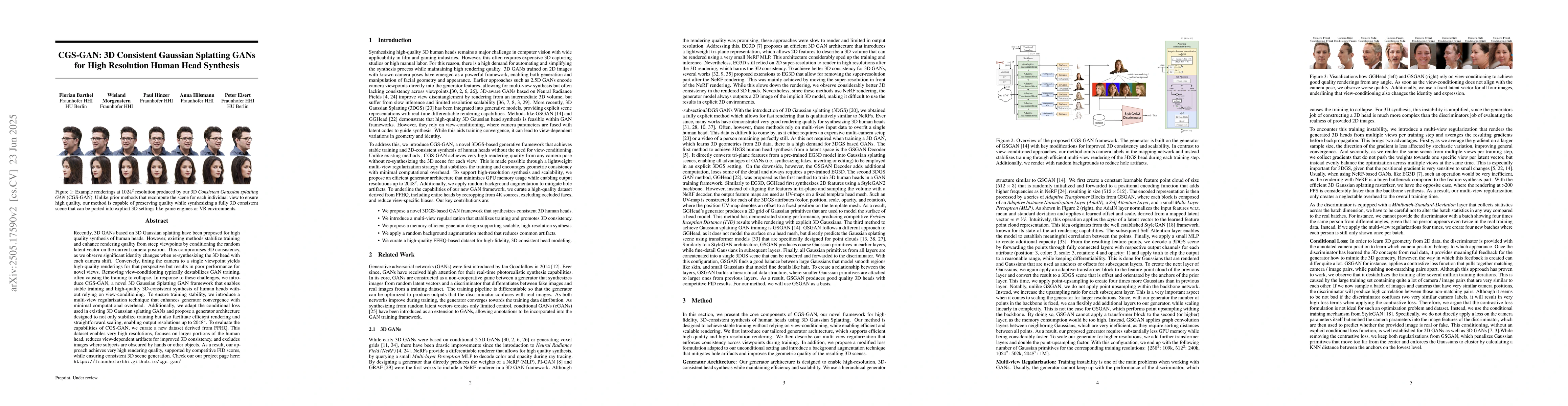 Recently, 3D GANs based on 3D Gaussian splatting have been proposed for high quality synthesis of human heads. However, existing methods stabilize training and enhance rendering quality from steep viewpoints by conditioning the random latent vector on the current camera position. This compromises 3D consistency, as we observe significant identity changes when re-synthesizing the 3D head with each camera shift. Conversely, fixing the camera to a single viewpoint yields high-quality renderings for that perspective but results in poor performance for novel views. Removing view-conditioning typically destabilizes GAN training, often causing the training to collapse. In response to these challenges, we introduce CGS-GAN, a novel 3D Gaussian Splatting GAN framework that enables stable training and high-quality 3D-consistent synthesis of human heads without relying on view-conditioning. To ensure training stability, we introduce a multi-view regularization technique that enhances generator convergence with minimal computational overhead. Additionally, we adapt the conditional loss used in existing 3D Gaussian splatting GANs and propose a generator architecture designed to not only stabilize training but also facilitate efficient rendering and straightforward scaling, enabling output resolutions up to $2048^2$. To evaluate the capabilities of CGS-GAN, we curate a new dataset derived from FFHQ. This dataset enables very high resolutions, focuses on larger portions of the human head, reduces view-dependent artifacts for improved 3D consistency, and excludes images where subjects are obscured by hands or other objects. As a result, our approach achieves very high rendering quality, supported by competitive FID scores, while ensuring consistent 3D scene generation. Check our our project page here: https://fraunhoferhhi.github.io/cgs-gan/