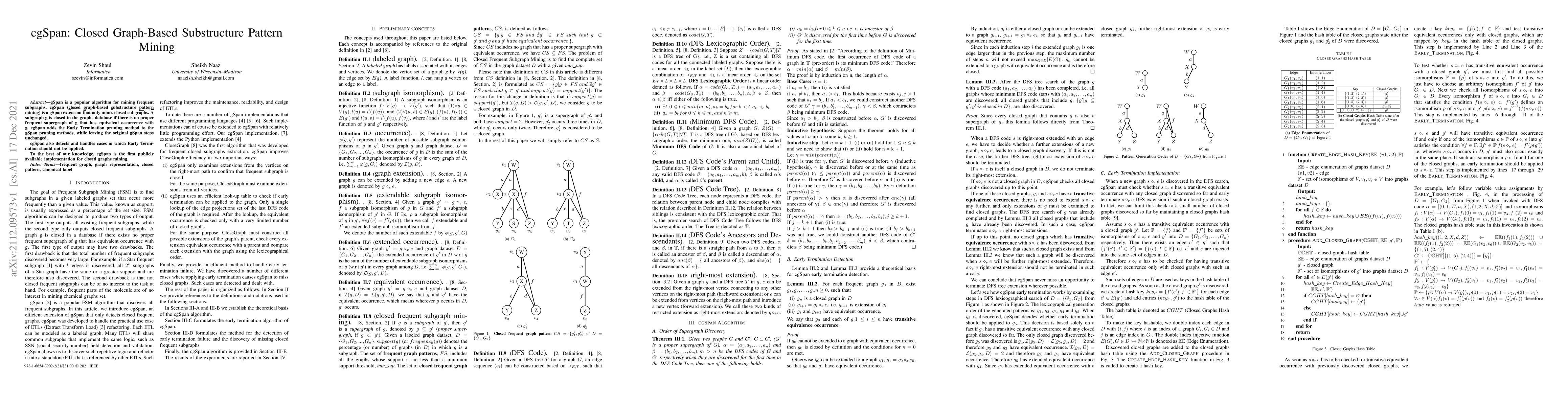 cgSpan is an extension of the gSpan algorithm focused on mining only closed frequent subgraphs, employing Early Termination pruning to enhance efficiency while maintaining gSpan’s original steps. It is the first publicly available tool for closed graph-based substructure pattern mining.