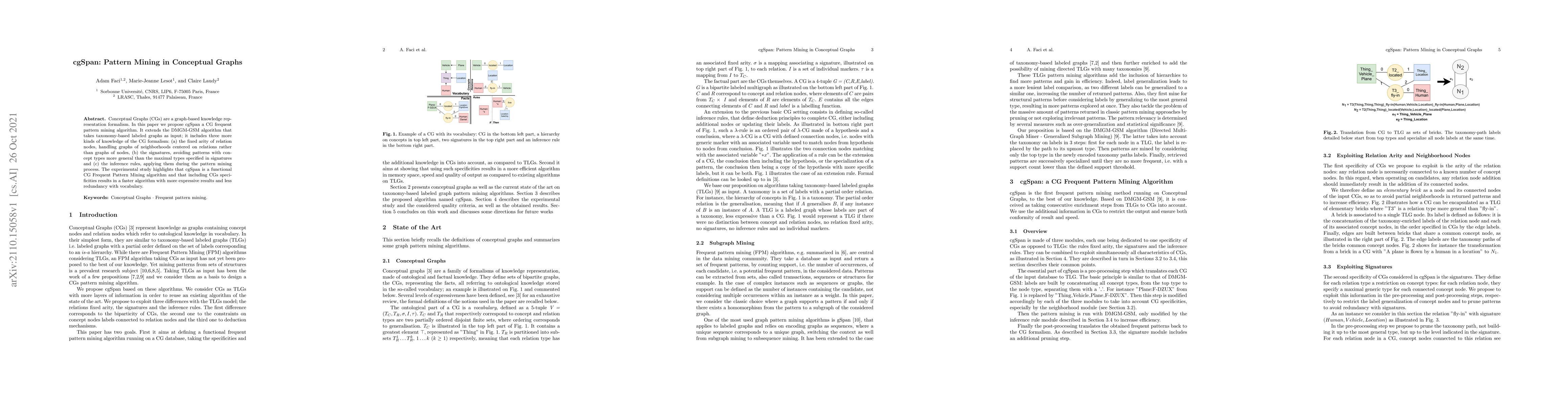 This paper introduces cgSpan, a novel algorithm for mining frequent patterns in Conceptual Graphs, extending the DMGM-GSM algorithm by incorporating fixed arity, signatures, and inference rules. Experimental results show that cgSpan is effective, faster, and produces more expressive and less redundant patterns compared to existing methods.
