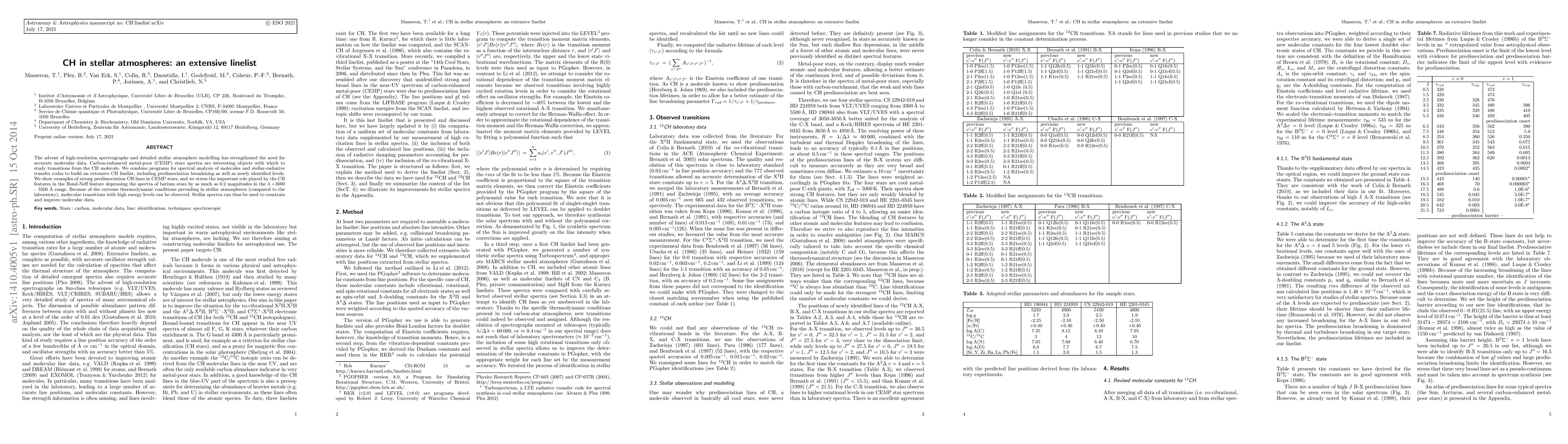 The advent of high-resolution spectrographs and detailed stellar atmosphere modelling has strengthened the need for accurate molecular data. Carbon-enhanced metal-poor (CEMP) stars spectra are interesting objects with which to study transitions from the CH molecule. We combine programs for spectral analysis of molecules and stellar-radiative transfer codes to build an extensive CH linelist, including predissociation broadening as well as newly identified levels. We show examples of strong predissociation CH lines in CEMP stars, and we stress the important role played by the CH features in the Bond-Neff feature depressing the spectra of barium stars by as much as 0.2 magnitudes in the $\lambda=$3000 -- 5500 \AA\ range. Because of the extreme thermodynamic conditions prevailing in stellar atmospheres (compared to the laboratory), molecular transitions with high energy levels can be observed. Stellar spectra can thus be used to constrain and improve molecular data.