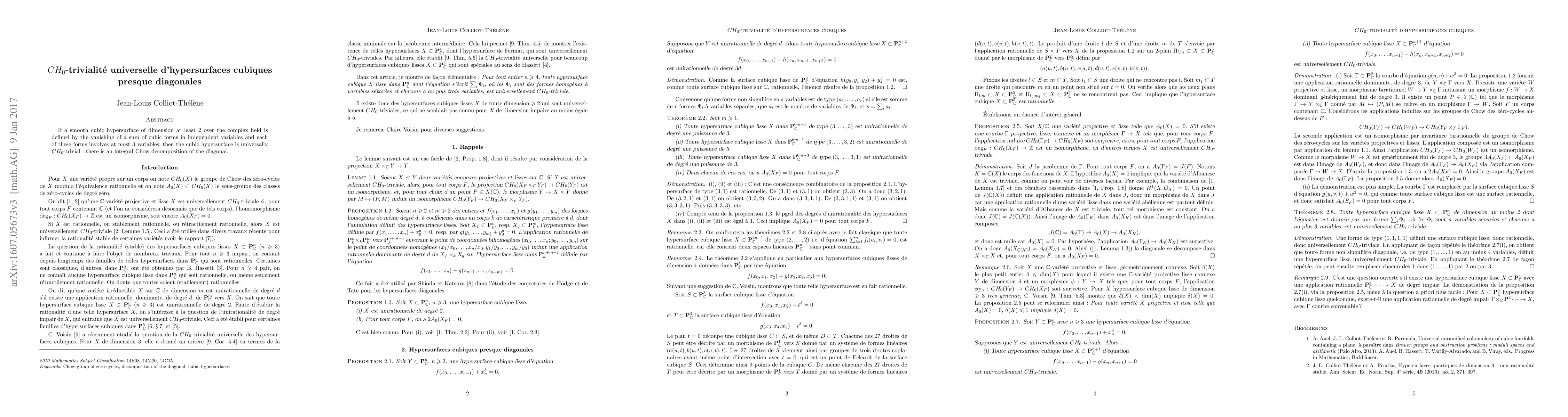 Toute hypersurface cubique lisse complexe de dimension au moins 2 dont l'\'equation est donn\'ee par l'annulation d'une somme de formes cubiques \`a variables s\'epar\'ees, chaque forme impliquant au plus trois variables, est universellement $CH_{0}$-triviale. --- If a smooth cubic hypersurface of dimension at least 2 is defined by the vanishing of a sum of cubic forms in independent variables and each of these forms involves at most 3 variables, then the cubic hypersurface is universally $CH_{0}$-trivial : there is an integral Chow decomposition of the diagonal.