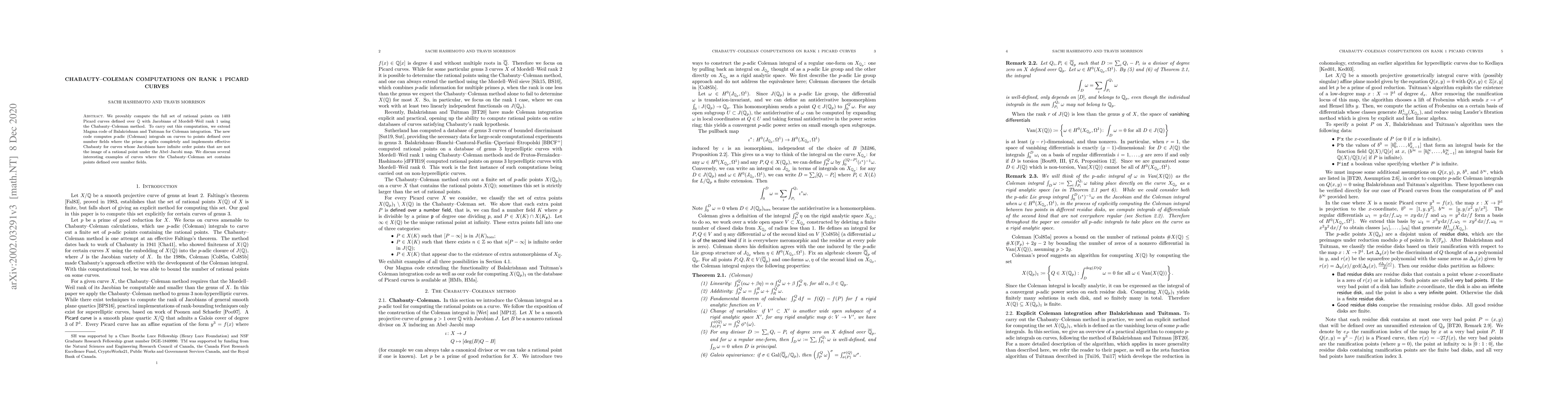 We provably compute the full set of rational points on 1403 Picard curves defined over $\mathbb{Q}$ with Jacobians of Mordell-Weil rank $1$ using the Chabauty-Coleman method. To carry out this computation, we extend Magma code of Balakrishnan and Tuitman for Coleman integration. The new code computes $p$-adic (Coleman) integrals on curves to points defined over number fields where the prime $p$ splits completely and implements effective Chabauty for curves whose Jacobians have infinite order points that are not the image of a rational point under the Abel-Jacobi map. We discuss several interesting examples of curves where the Chabauty-Coleman set contains points defined over number fields.