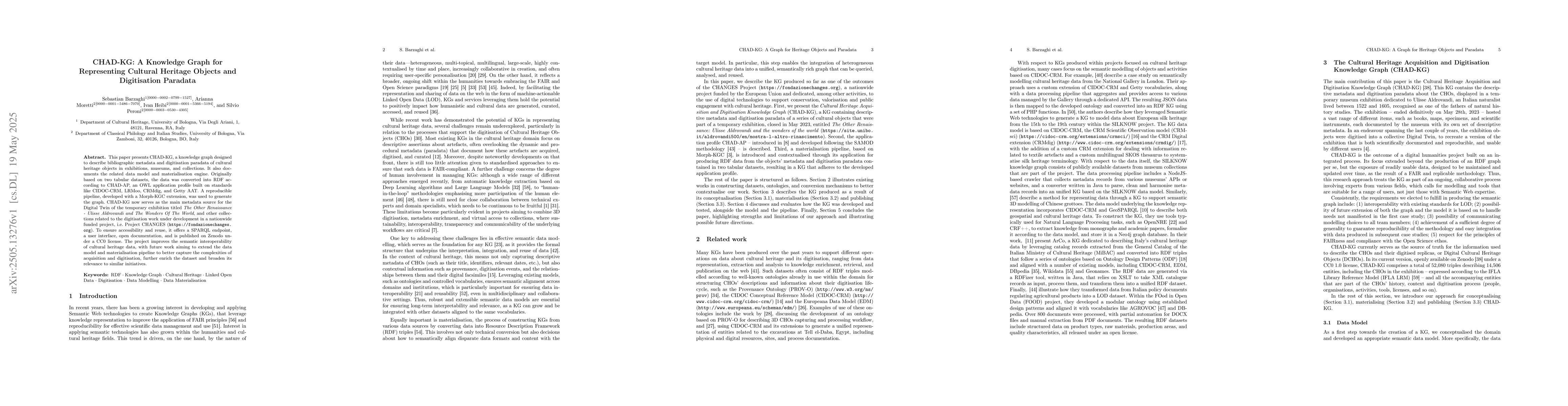 CHAD-KG distinguishes itself by integrating both bibliographic metadata and digitisation paradata of cultural heritage objects, offering improved semantic interoperability through a SPARQL endpoint and open documentation.