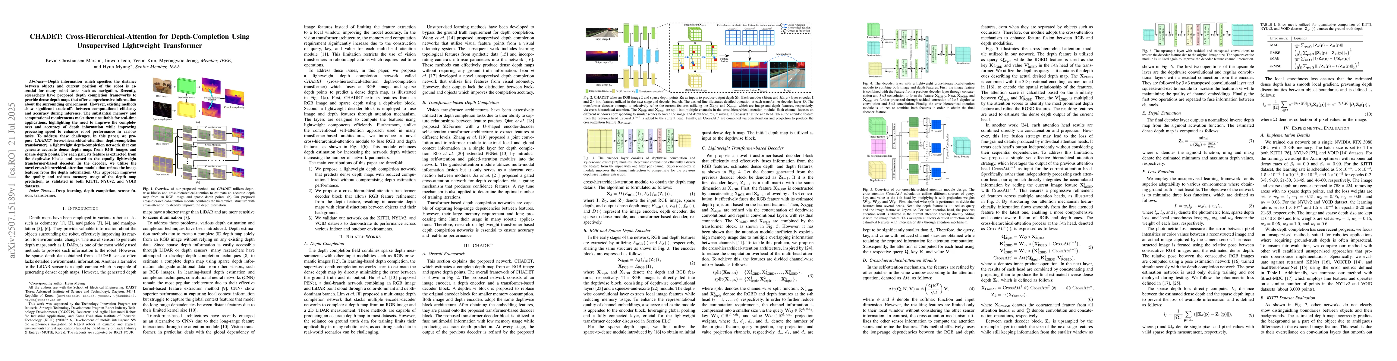 The paper introduces CHADET, a lightweight transformer-based network for depth completion from RGB images and sparse depth points. CHADET uses depthwise blocks and a cross-hierarchical-attention decoder to generate accurate, dense depth maps with reduced memory usage, outperforming existing methods in terms of efficiency and accuracy on KITTI, NYUv2, and VOID datasets.