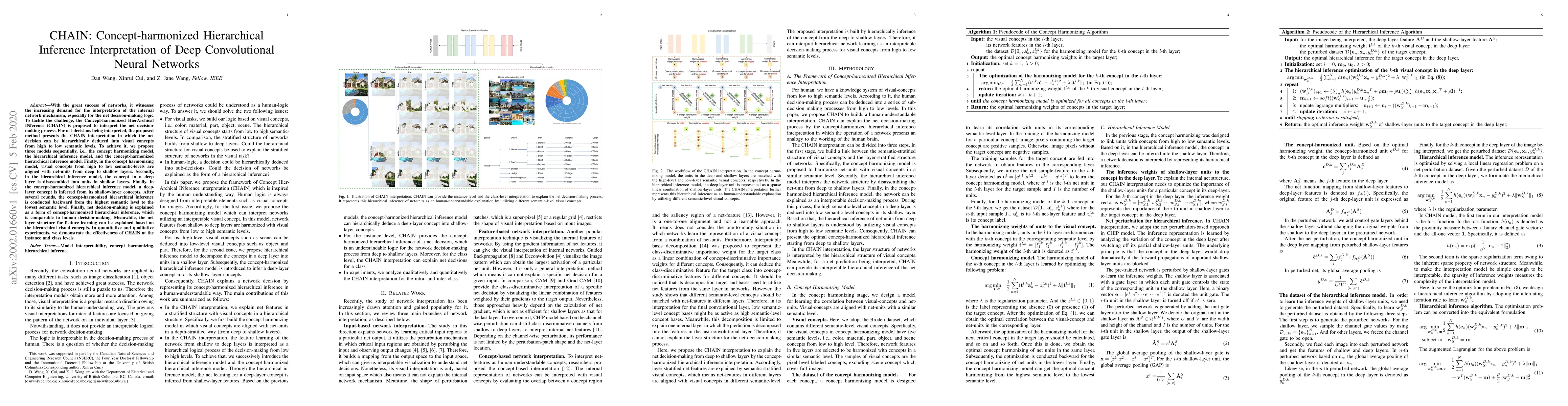 The paper introduces CHAIN, a method for interpreting deep convolutional neural networks by breaking down net decisions into hierarchical visual concepts from high to low semantic levels. The approach involves three models to align, disassemble, and infer concepts, ultimately explaining network decision-making in a manner comparable to human reasoning. Experiments show CHAIN's effectiveness in interpreting both instance and class-level decisions.