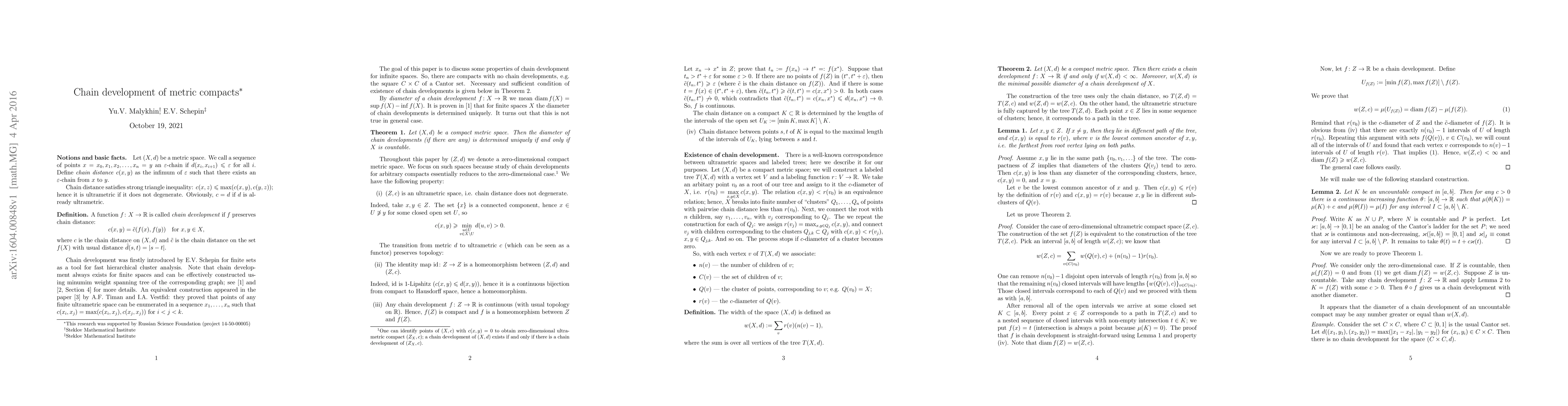 Chain distance between points in a metric space is defined as the infimum of epsilon such that there is an epsilon-chain connecting these points. We call a mapping of a metric compact into the real line a chain development if it preserves chain distances. We give a criterium of existence of the chain development for metric compacts. We prove the diameter of any chain development of a given compact to be the same iff the compact is countable.