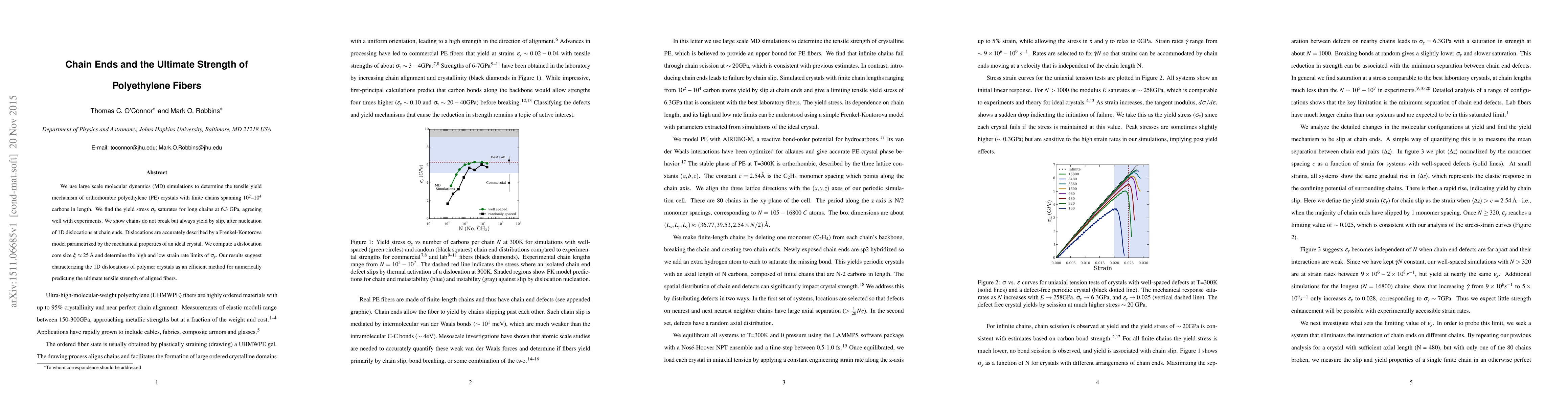 Large scale molecular dynamics (MD) simulations were employed to analyze the tensile yield mechanism of orthorhombic polyethylene (PE) crystals with varying chain lengths.