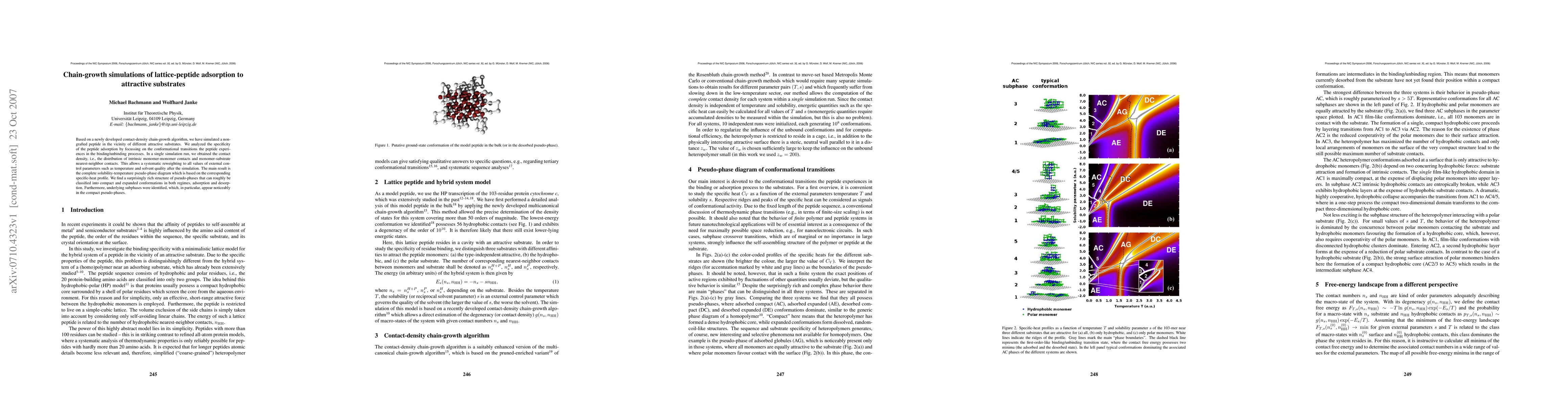 This paper uses a novel chain-growth algorithm to simulate lattice-peptide adsorption near attractive substrates, revealing complex conformational transitions during binding/unbinding. The study produces a detailed solubility-temperature pseudo-phase diagram, identifying both compact and expanded pseudo-phases with underlying subphases.